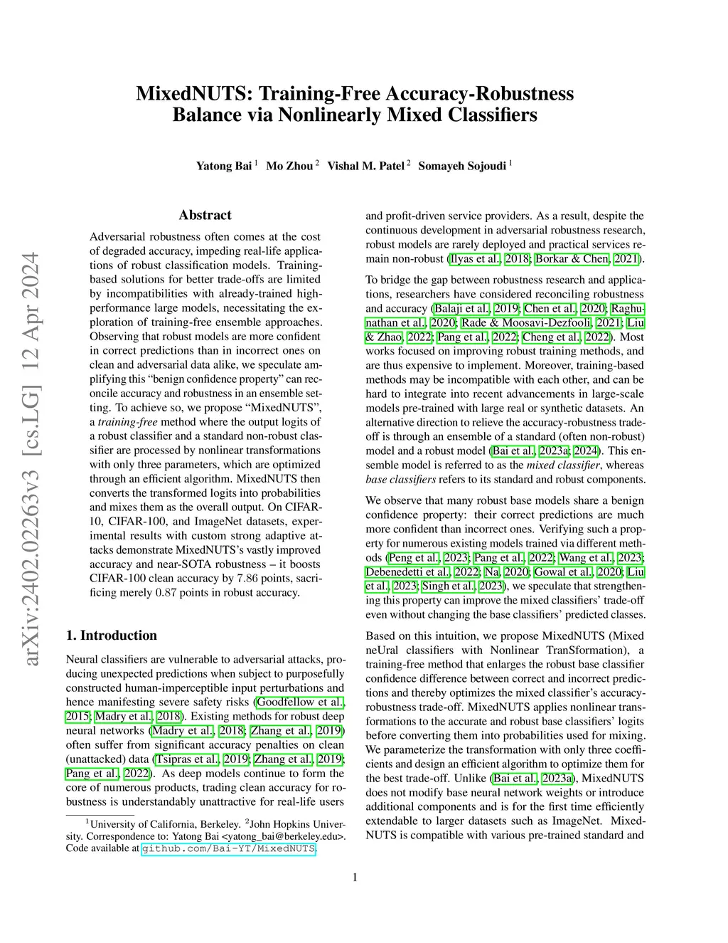 Adversarial robustness often comes at the cost of degraded accuracy, impeding the real-life application of robust classification models. Training-based solutions for better trade-offs are limited by incompatibilities with already-trained high-performance large models, necessitating the exploration of training-free ensemble approaches. Observing that robust models are more confident in correct predictions than in incorrect ones on clean and adversarial data alike, we speculate amplifying this "benign confidence property" can reconcile accuracy and robustness in an ensemble setting. To achieve so, we propose "MixedNUTS", a training-free method where the output logits of a robust classifier and a standard non-robust classifier are processed by nonlinear transformations with only three parameters, which are optimized through an efficient algorithm. MixedNUTS then converts the transformed logits into probabilities and mixes them as the overall output. On CIFAR-10, CIFAR-100, and ImageNet datasets, experimental results with custom strong adaptive attacks demonstrate MixedNUTS's vastly improved accuracy and near-SOTA robustness -- it boosts CIFAR-100 clean accuracy by 7.86 points, sacrificing merely 0.87 points in robust accuracy.