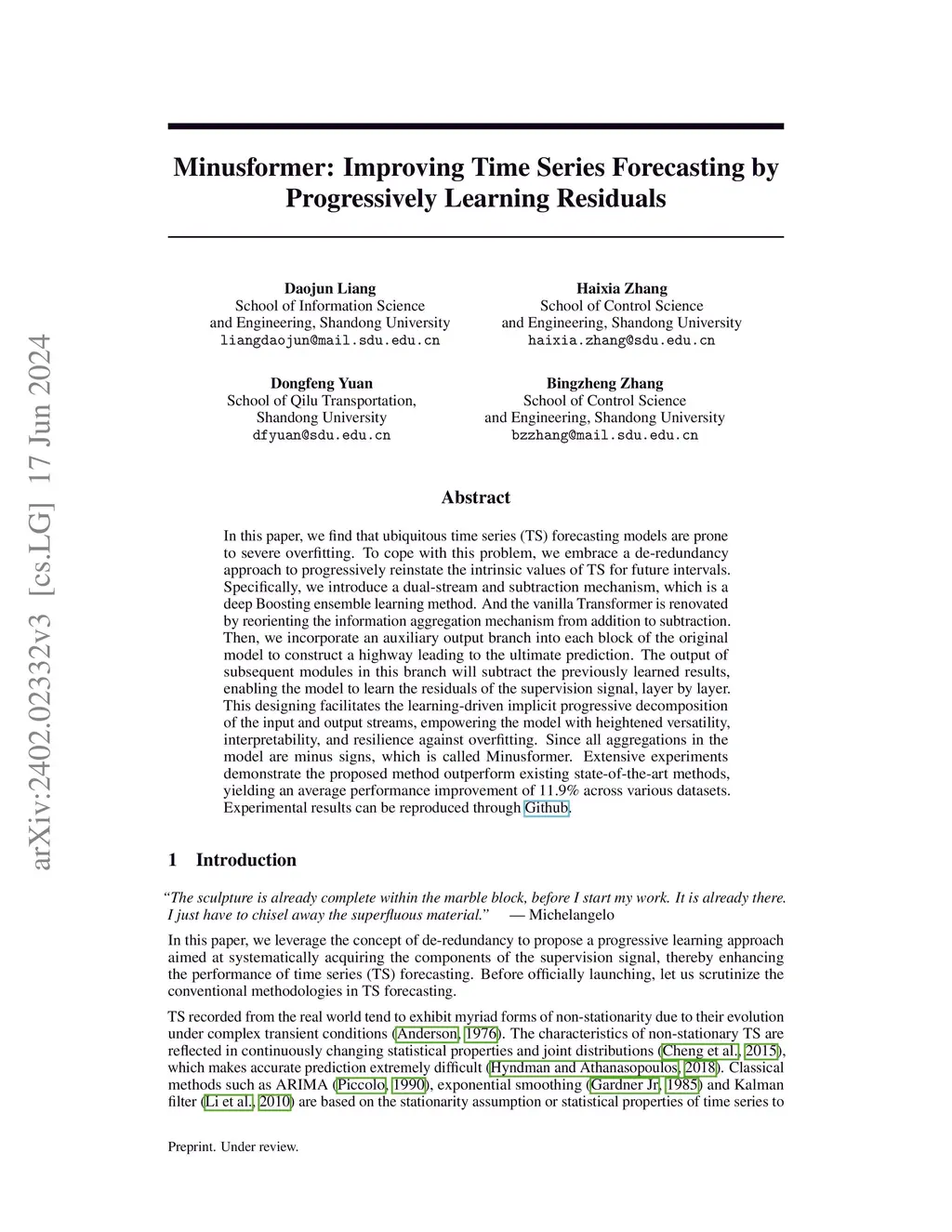 In this paper, we find that ubiquitous time series (TS) forecasting models are prone to severe overfitting. To cope with this problem, we embrace a de-redundancy approach to progressively reinstate the intrinsic values of TS for future intervals. Specifically, we introduce a dual-stream and subtraction mechanism, which is a deep Boosting ensemble learning method. And the vanilla Transformer is renovated by reorienting the information aggregation mechanism from addition to subtraction. Then, we incorporate an auxiliary output branch into each block of the original model to construct a highway leading to the ultimate prediction. The output of subsequent modules in this branch will subtract the previously learned results, enabling the model to learn the residuals of the supervision signal, layer by layer. This designing facilitates the learning-driven implicit progressive decomposition of the input and output streams, empowering the model with heightened versatility, interpretability, and resilience against overfitting. Since all aggregations in the model are minus signs, which is called Minusformer. Extensive experiments demonstrate the proposed method outperform existing state-of-the-art methods, yielding an average performance improvement of 11.9% across various datasets.The code has been released at https://github.com/Anoise/Minusformer.