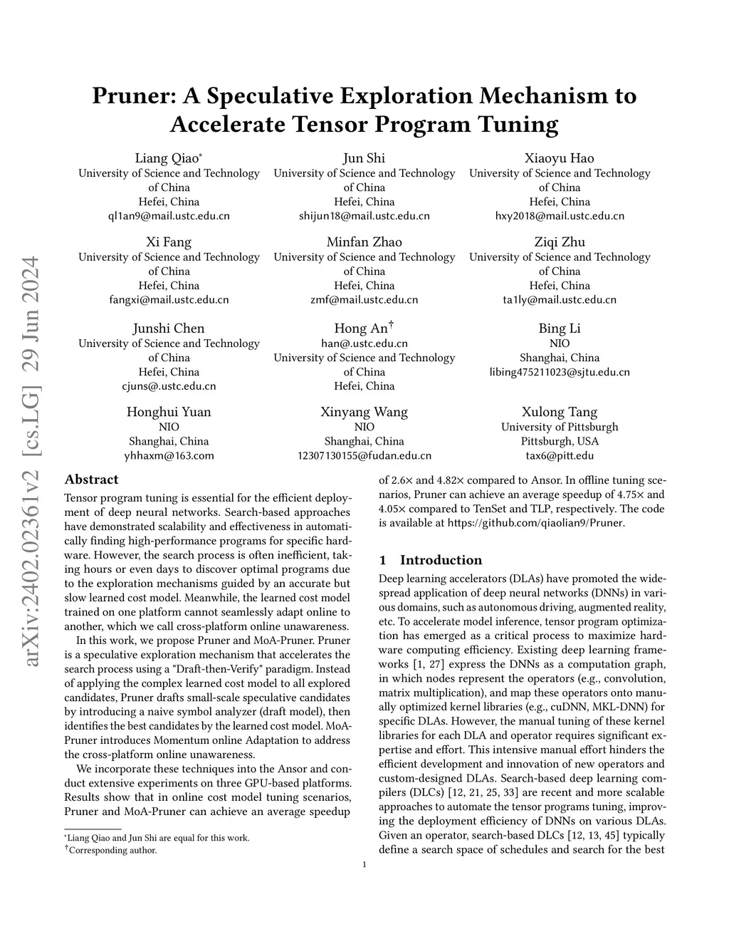 Tensor program tuning is essential for the efficient deployment of deep neural networks. Search-based approaches have demonstrated scalability and effectiveness in automatically finding high-performance programs for specific hardware. However, the search process is often inefficient, taking hours or even days to discover optimal programs due to the exploration mechanisms guided by an accurate but slow-learned cost model. Meanwhile, the learned cost model trained on one platform cannot seamlessly adapt online to another, which we call cross-platform online unawareness.In this work, we propose Pruner and MoA-Pruner. Pruner is a "Draft-then-Verify" exploration mechanism that accelerates the schedule search process. Instead of applying the complex learned cost model to all explored candidates, Pruner drafts small-scale potential candidates by introducing a naive Symbol-based Analyzer (draft model), then identifies the best candidates by the learned cost model. MoA-Pruner introduces a Momentum online Adaptation strategy to address the cross-platform online unawareness.We incorporate Pruner into the TVM and conduct extensive experiments on three GPU-based platforms. Results show considerable speedup in schedule search time. In online tuning scenarios, Pruner and MoA-Pruner achieve an average speedup of and compared to Ansor. In offline tuning scenarios, Pruner achieves an average speedup of and compared to TenSet and TLP, respectively. Furthermore, Pruner achieves an average speedup of compared to MetaSchedule on TensorCore.