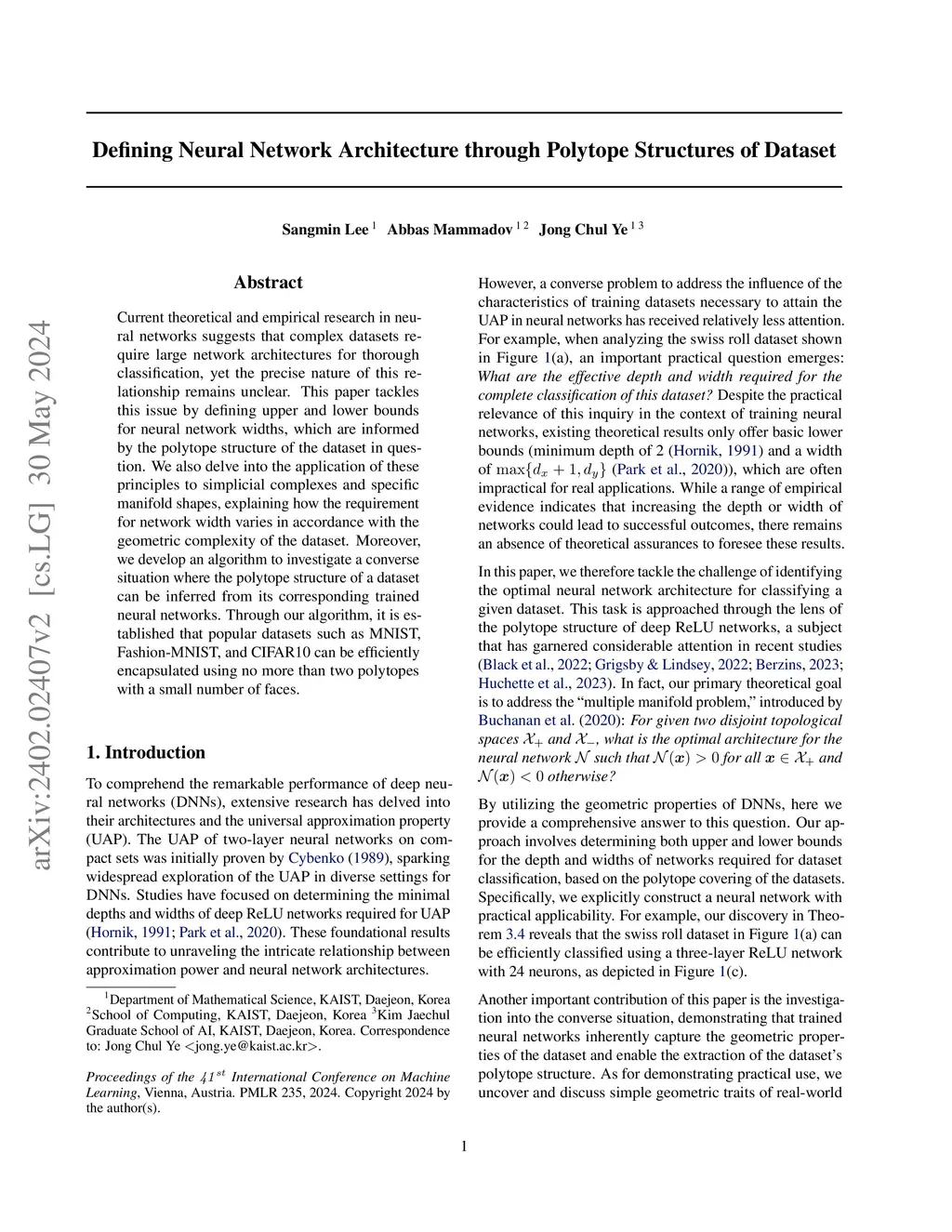 Current theoretical and empirical research in neural networks suggests that complex datasets require large network architectures for thorough classification, yet the precise nature of this relationship remains unclear. This paper tackles this issue by defining upper and lower bounds for neural network widths, which are informed by the polytope structure of the dataset in question. We also delve into the application of these principles to simplicial complexes and specific manifold shapes, explaining how the requirement for network width varies in accordance with the geometric complexity of the dataset. Moreover, we develop an algorithm to investigate a converse situation where the polytope structure of a dataset can be inferred from its corresponding trained neural networks. Through our algorithm, it is established that popular datasets such as MNIST, Fashion-MNIST, and CIFAR10 can be efficiently encapsulated using no more than two polytopes with a small number of faces.