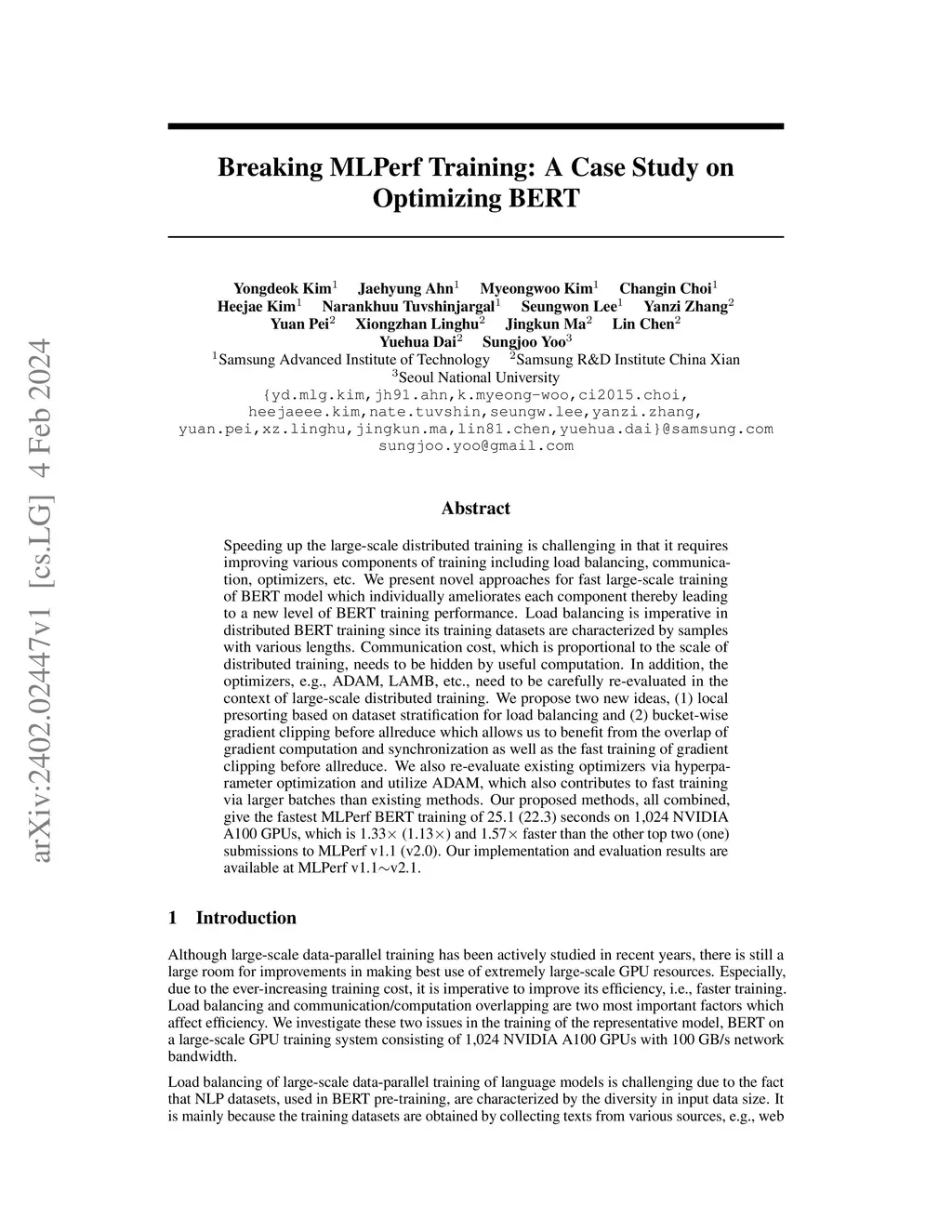 Speeding up the large-scale distributed training is challenging in that it requires improving various components of training including load balancing, communication, optimizers, etc. We present novel approaches for fast large-scale training of BERT model which individually ameliorates each component thereby leading to a new level of BERT training performance. Load balancing is imperative in distributed BERT training since its training datasets are characterized by samples with various lengths. Communication cost, which is proportional to the scale of distributed training, needs to be hidden by useful computation. In addition, the optimizers, e.g., ADAM, LAMB, etc., need to be carefully re-evaluated in the context of large-scale distributed training. We propose two new ideas, (1) local presorting based on dataset stratification for load balancing and (2) bucket-wise gradient clipping before allreduce which allows us to benefit from the overlap of gradient computation and synchronization as well as the fast training of gradient clipping before allreduce. We also re-evaluate existing optimizers via hyperparameter optimization and utilize ADAM, which also contributes to fast training via larger batches than existing methods. Our proposed methods, all combined, give the fastest MLPerf BERT training of 25.1 (22.3) seconds on 1,024 NVIDIA A100 GPUs, which is 1.33x (1.13x) and 1.57x faster than the other top two (one) submissions to MLPerf v1.1 (v2.0). Our implementation and evaluation results are available at MLPerf v1.1~v2.1.