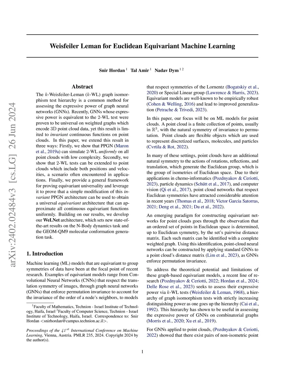 The -Weisfeiler-Leman (-WL) graph isomorphism test hierarchy is a common method for assessing the expressive power of graph neural networks (GNNs). Recently, GNNs whose expressive power is equivalent to the -WL test were proven to be universal on weighted graphs which encode point cloud data, yet this result is limited to invariant continuous functions on point clouds. In this paper, we extend this result in three ways: Firstly, we show that PPGN can simulate -WL uniformly on all point clouds with low complexity. Secondly, we show that -WL tests can be extended to point clouds which include both positions and velocities, a scenario often encountered in applications. Finally, we provide a general framework for proving equivariant universality and leverage it to prove that a simple modification of this invariant PPGN architecture can be used to obtain a universal equivariant architecture that can approximate all continuous equivariant functions uniformly. Building on our results, we develop our WeLNet architecture, which sets new state-of-the-art results on the N-Body dynamics task and the GEOM-QM9 molecular conformation generation task.