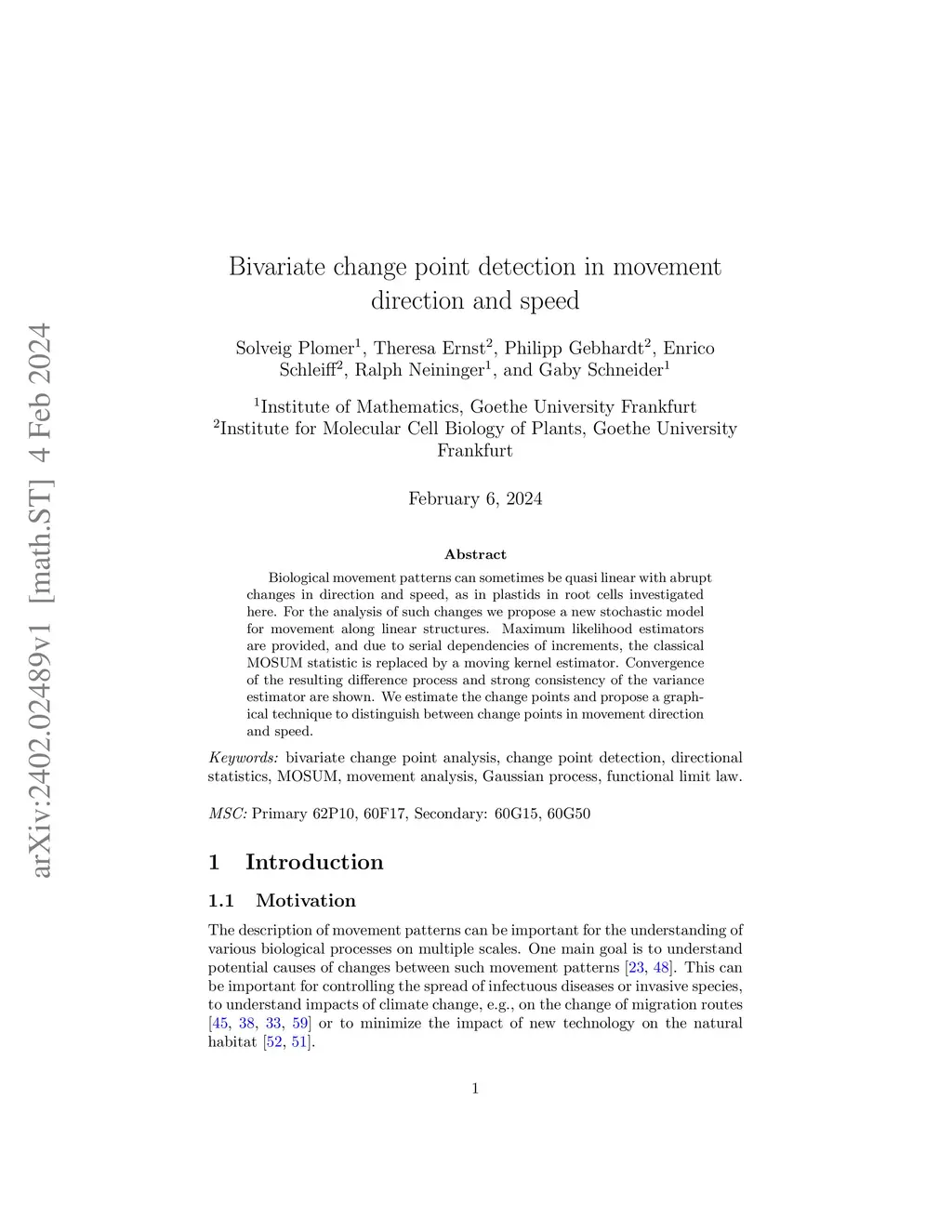 Biological movement patterns can sometimes be quasi linear with abrupt changes in direction and speed, as in plastids in root cells investigated here. For the analysis of such changes we propose a new stochastic model for movement along linear structures. Maximum likelihood estimators are provided, and due to serial dependencies of increments, the classical MOSUM statistic is replaced by a moving kernel estimator. Convergence of the resulting difference process and strong consistency of the variance estimator are shown. We estimate the change points and propose a graphical technique to distinguish between change points in movement direction and speed.
