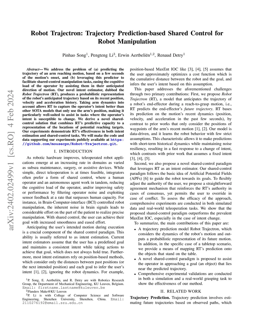 We address the problem of (a) predicting the trajectory of an arm reaching motion, based on a few seconds of the motion's onset, and (b) leveraging this predictor to facilitate shared-control manipulation tasks, easing the cognitive load of the operator by assisting them in their anticipated direction of motion. Our novel intent estimator, dubbed the \emph{Robot Trajectron} (RT), produces a probabilistic representation of the robot's anticipated trajectory based on its recent position, velocity and acceleration history. Taking arm dynamics into account allows RT to capture the operator's intent better than other SOTA models that only use the arm's position, making it particularly well-suited to assist in tasks where the operator's intent is susceptible to change. We derive a novel shared-control solution that combines RT's predictive capacity to a representation of the locations of potential reaching targets. Our experiments demonstrate RT's effectiveness in both intent estimation and shared-control tasks. We will make the code and data supporting our experiments publicly available at https://github.com/mousecpn/Robot-Trajectron.git.