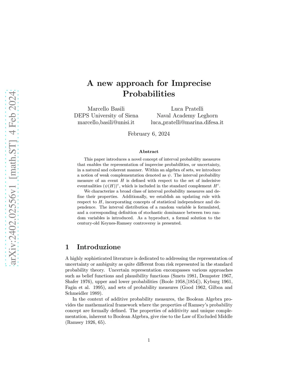 This paper introduces a novel concept of interval probability measures that enables the representation of imprecise probabilities, or uncertainty, in a natural and coherent manner. Within an algebra of sets, we introduce a notion of weak complementation denoted as . The interval probability measure of an event is defined with respect to the set of indecisive eventualities , which is included in the standard complement . We characterize a broad class of interval probability measures and define their properties. Additionally, we establish an updating rule with respect to , incorporating concepts of statistical independence and dependence. The interval distribution of a random variable is formulated, and a corresponding definition of stochastic dominance between two random variables is introduced. As a byproduct, a formal solution to the century-old Keynes-Ramsey controversy is presented.