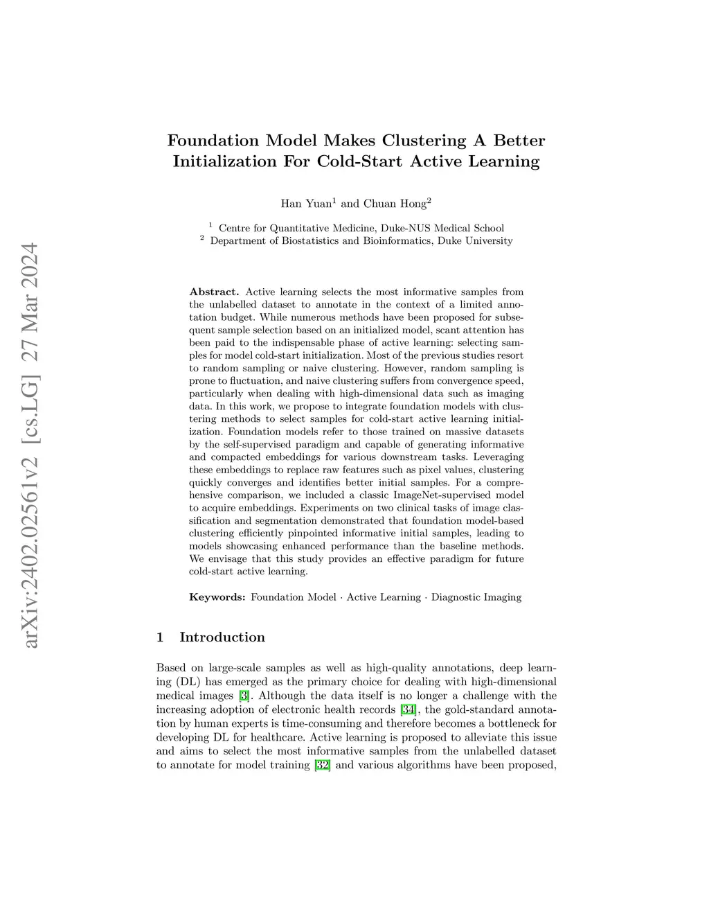 Active learning selects the most informative samples from the unlabelled dataset to annotate in the context of a limited annotation budget. While numerous methods have been proposed for subsequent sample selection based on an initialized model, scant attention has been paid to the indispensable phase of active learning: selecting samples for model cold-start initialization. Most of the previous studies resort to random sampling or naive clustering. However, random sampling is prone to fluctuation, and naive clustering suffers from convergence speed, particularly when dealing with high-dimensional data such as imaging data. In this work, we propose to integrate foundation models with clustering methods to select samples for cold-start active learning initialization. Foundation models refer to those trained on massive datasets by the self-supervised paradigm and capable of generating informative and compacted embeddings for various downstream tasks. Leveraging these embeddings to replace raw features such as pixel values, clustering quickly converges and identifies better initial samples. For a comprehensive comparison, we included a classic ImageNet-supervised model to acquire embeddings. Experiments on two clinical tasks of image classification and segmentation demonstrated that foundation model-based clustering efficiently pinpointed informative initial samples, leading to models showcasing enhanced performance than the baseline methods. We envisage that this study provides an effective paradigm for future cold-start active learning.