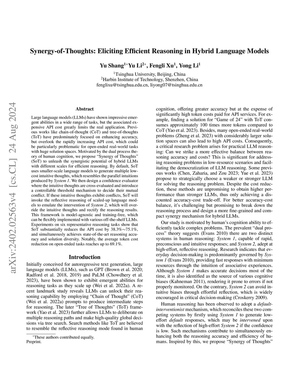 Large language models (LLMs) have shown impressive emergent abilities in a wide range of tasks, but still face challenges in handling complex reasoning problems. Previous works like chain-of-thought (CoT) and tree-of-thoughts (ToT) have predominately focused on enhancing accuracy, but overlook the rapidly increasing token cost, which could be particularly problematic for open-ended real-world tasks with huge solution spaces. Motivated by the dual process theory of human cognition, we propose "Synergy of Thoughts" (SoT) to unleash the synergistic potential of hybrid LLMs for efficient reasoning. By default, SoT uses smaller-scale language models to generate multiple low-cost reasoning thoughts, which resembles the parallel intuitions produced by System 1. If these intuitions exhibit conflicts, SoT will invoke the reflective reasoning of scaled-up language models to emulate the intervention of System 2, which will override the intuitive thoughts and rectify the reasoning process. This framework is model-agnostic and training-free, which can be flexibly implemented with various off-the-shelf LLMs. Experiments on six representative reasoning tasks show that SoT substantially reduces the token cost by 38.3%-75.1%, and simultaneously achieves state-of-the-art reasoning accuracy and solution diversity. Notably, the average token cost reduction on open-ended tasks reaches up to 69.1%. Code repo with all prompts will be released upon publication.