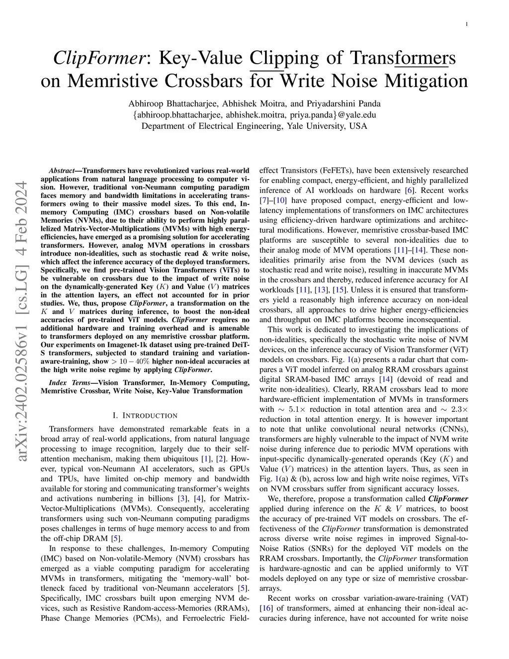 Transformers have revolutionized various real-world applications from natural language processing to computer vision. However, traditional von-Neumann computing paradigm faces memory and bandwidth limitations in accelerating transformers owing to their massive model sizes. To this end, In-memory Computing (IMC) crossbars based on Non-volatile Memories (NVMs), due to their ability to perform highly parallelized Matrix-Vector-Multiplications (MVMs) with high energy-efficiencies, have emerged as a promising solution for accelerating transformers. However, analog MVM operations in crossbars introduce non-idealities, such as stochastic read & write noise, which affect the inference accuracy of the deployed transformers. Specifically, we find pre-trained Vision Transformers (ViTs) to be vulnerable on crossbars due to the impact of write noise on the dynamically-generated Key (K) and Value (V) matrices in the attention layers, an effect not accounted for in prior studies. We, thus, propose ClipFormer, a transformation on the K and V matrices during inference, to boost the non-ideal accuracies of pre-trained ViT models. ClipFormer requires no additional hardware and training overhead and is amenable to transformers deployed on any memristive crossbar platform. Our experiments on Imagenet-1k dataset using pre-trained DeiT-S transformers, subjected to standard training and variation-aware-training, show >10-40% higher non-ideal accuracies at the high write noise regime by applying ClipFormer.