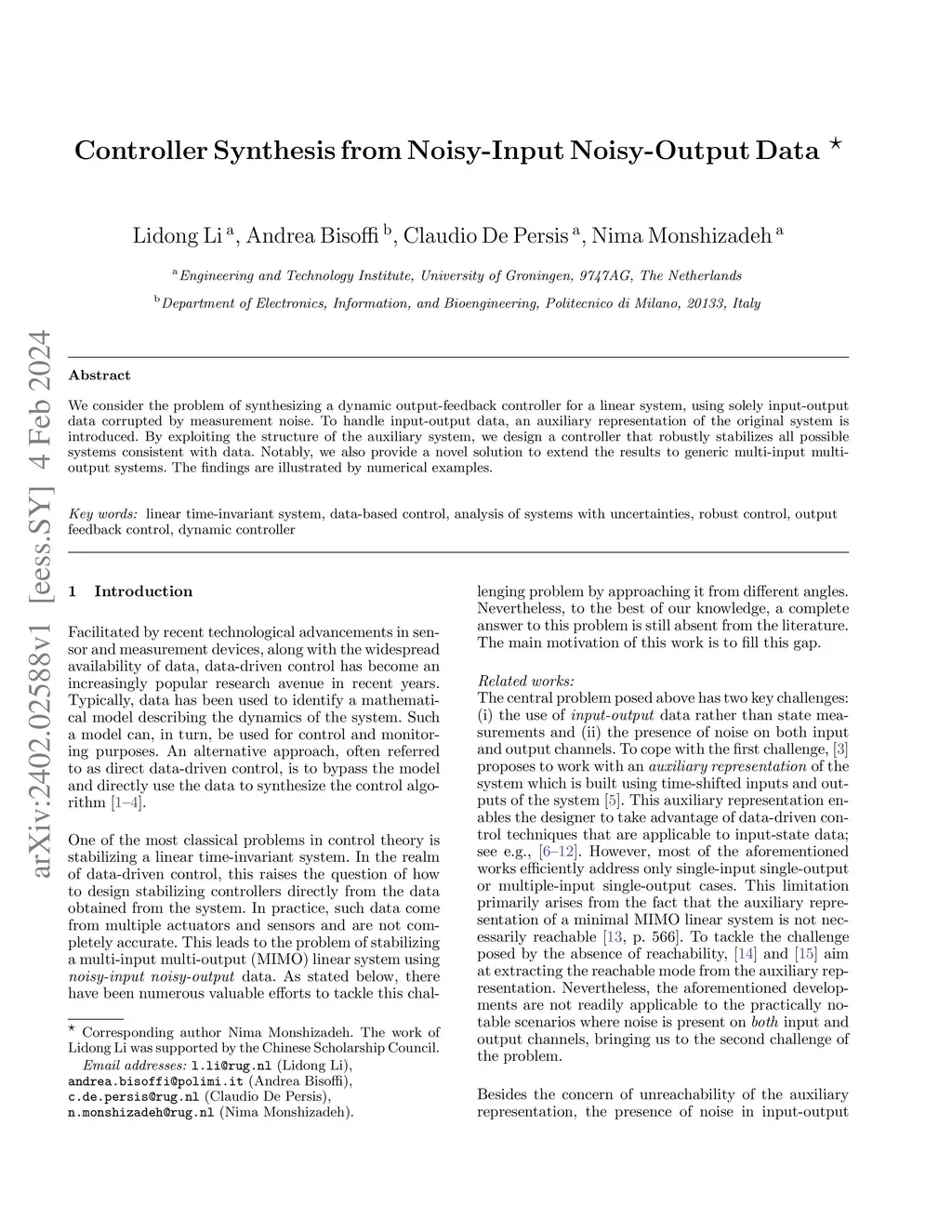 Controller Synthesis from Noisy-Input Noisy-Output Data