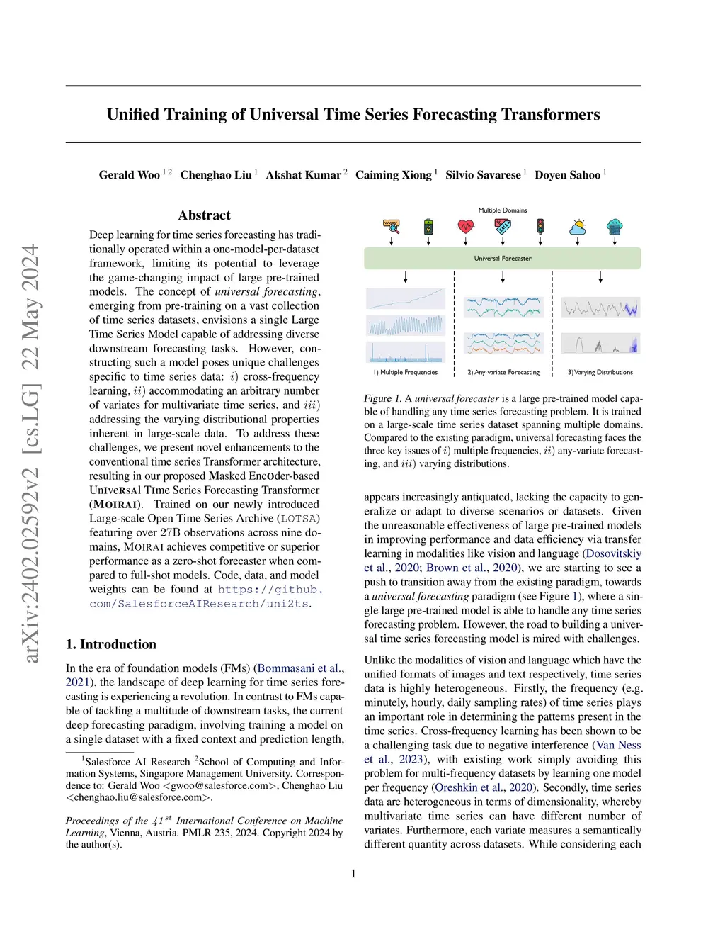 Deep learning for time series forecasting has traditionally operated within a one-model-per-dataset framework, limiting its potential to leverage the game-changing impact of large pre-trained models. The concept of universal forecasting, emerging from pre-training on a vast collection of time series datasets, envisions a single Large Time Series Model capable of addressing diverse downstream forecasting tasks. However, constructing such a model poses unique challenges specific to time series data: i) cross-frequency learning, ii) accommodating an arbitrary number of variates for multivariate time series, and iii) addressing the varying distributional properties inherent in large-scale data. To address these challenges, we present novel enhancements to the conventional time series Transformer architecture, resulting in our proposed Masked Encoder-based Universal Time Series Forecasting Transformer (Moirai). Trained on our newly introduced Large-scale Open Time Series Archive (LOTSA) featuring over 27B observations across nine domains, Moirai achieves competitive or superior performance as a zero-shot forecaster when compared to full-shot models. Code, data, and model weights can be found at https://github.com/SalesforceAIResearch/uni2ts.