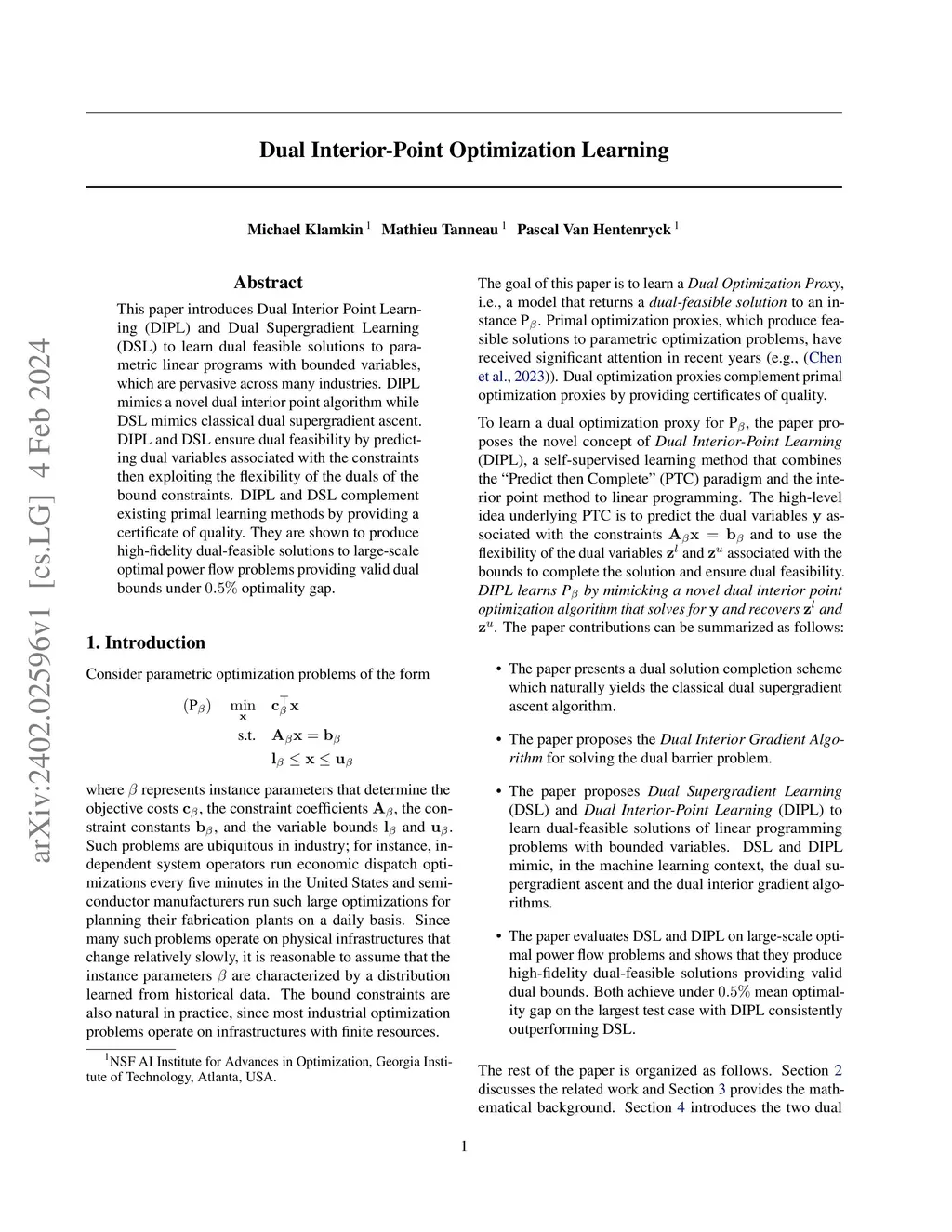 Dual Interior Point Optimization Learning