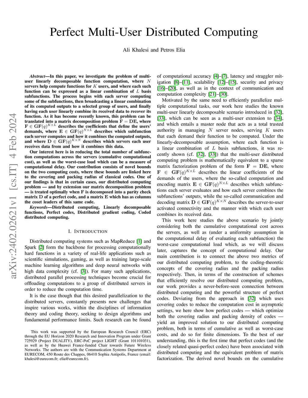 In this paper, we investigate the problem of multi-user linearly decomposable function computation, where servers help compute functions for users, and where each such function can be expressed as a linear combination of basis subfunctions. The process begins with each server computing some of the subfunctions, then broadcasting a linear combination of its computed outputs to a selected group of users, and finally having each user linearly combine its received data to recover its function. As it has become recently known, this problem can be translated into a matrix decomposition problem , where describes the coefficients that define the users' demands, where describes which subfunction each server computes and how it combines the computed outputs, and where describes which servers each user receives data from and how it combines this data. Our interest here is in reducing the total number of subfunction computations across the servers (cumulative computational cost), as well as the worst-case load which can be a measure of computational delay. Our contribution consists of novel bounds on the two computing costs, where these bounds are linked here to the covering and packing radius of classical codes. One of our findings is that in certain cases, our distributed computing problem -- and by extension our matrix decomposition problem -- is treated optimally when is decomposed into a parity check matrix of a perfect code, and a matrix which has as columns the coset leaders of this same code.