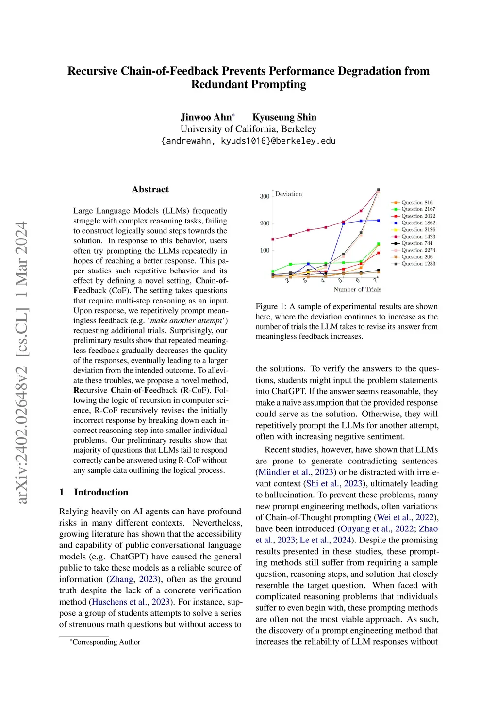 Large Language Models (LLMs) frequently struggle with complex reasoning tasks, failing to construct logically sound steps towards the solution. In response to this behavior, users often try prompting the LLMs repeatedly in hopes of reaching a better response. This paper studies such repetitive behavior and its effect by defining a novel setting, Chain-of-Feedback (CoF). The setting takes questions that require multi-step reasoning as an input. Upon response, we repetitively prompt meaningless feedback (e.g. 'make another attempt') requesting additional trials. Surprisingly, our preliminary results show that repeated meaningless feedback gradually decreases the quality of the responses, eventually leading to a larger deviation from the intended outcome. To alleviate these troubles, we propose a novel method, Recursive Chain-of-Feedback (R-CoF). Following the logic of recursion in computer science, R-CoF recursively revises the initially incorrect response by breaking down each incorrect reasoning step into smaller individual problems. Our preliminary results show that majority of questions that LLMs fail to respond correctly can be answered using R-CoF without any sample data outlining the logical process.