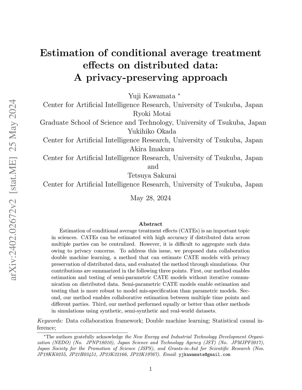 Estimation of conditional average treatment effects on distributed confidential data