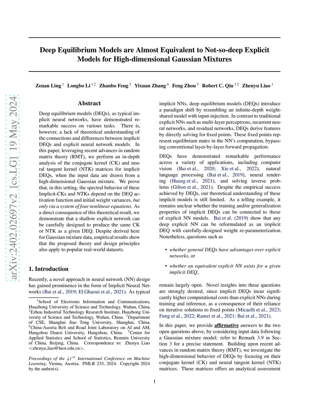Deep equilibrium models (DEQs), as a typical implicit neural network, have demonstrated remarkable success on various tasks. There is, however, a lack of theoretical understanding of the connections and differences between implicit DEQs and explicit neural network models. In this paper, leveraging recent advances in random matrix theory (RMT), we perform an in-depth analysis on the eigenspectra of the conjugate kernel (CK) and neural tangent kernel (NTK) matrices for implicit DEQs, when the input data are drawn from a high-dimensional Gaussian mixture. We prove, in this setting, that the spectral behavior of these Implicit-CKs and NTKs depend on the DEQ activation function and initial weight variances, but only via a system of four nonlinear equations. As a direct consequence of this theoretical result, we demonstrate that a shallow explicit network can be carefully designed to produce the same CK or NTK as a given DEQ. Despite derived here for Gaussian mixture data, empirical results show the proposed theory and design principle also apply to popular real-world datasets.