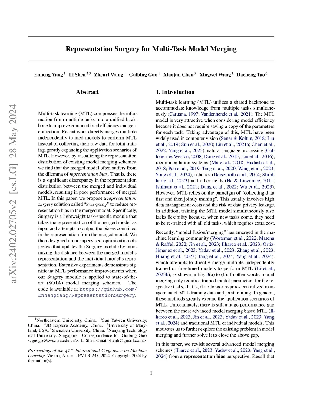 Multi-task learning (MTL) compresses the information from multiple tasks into a unified backbone to improve computational efficiency and generalization. Recent work directly merges multiple independently trained models to perform MTL instead of collecting their raw data for joint training, greatly expanding the application scenarios of MTL. However, by visualizing the representation distribution of existing model merging schemes, we find that the merged model often suffers from the dilemma of representation bias. That is, there is a significant discrepancy in the representation distribution between the merged and individual models, resulting in poor performance of merged MTL. In this paper, we propose a representation surgery solution called "Surgery" to reduce representation bias in the merged model. Specifically, Surgery is a lightweight task-specific module that takes the representation of the merged model as input and attempts to output the biases contained in the representation from the merged model. We then designed an unsupervised optimization objective that updates the Surgery module by minimizing the distance between the merged model's representation and the individual model's representation. Extensive experiments demonstrate significant MTL performance improvements when our Surgery module is applied to state-of-the-art (SOTA) model merging schemes.