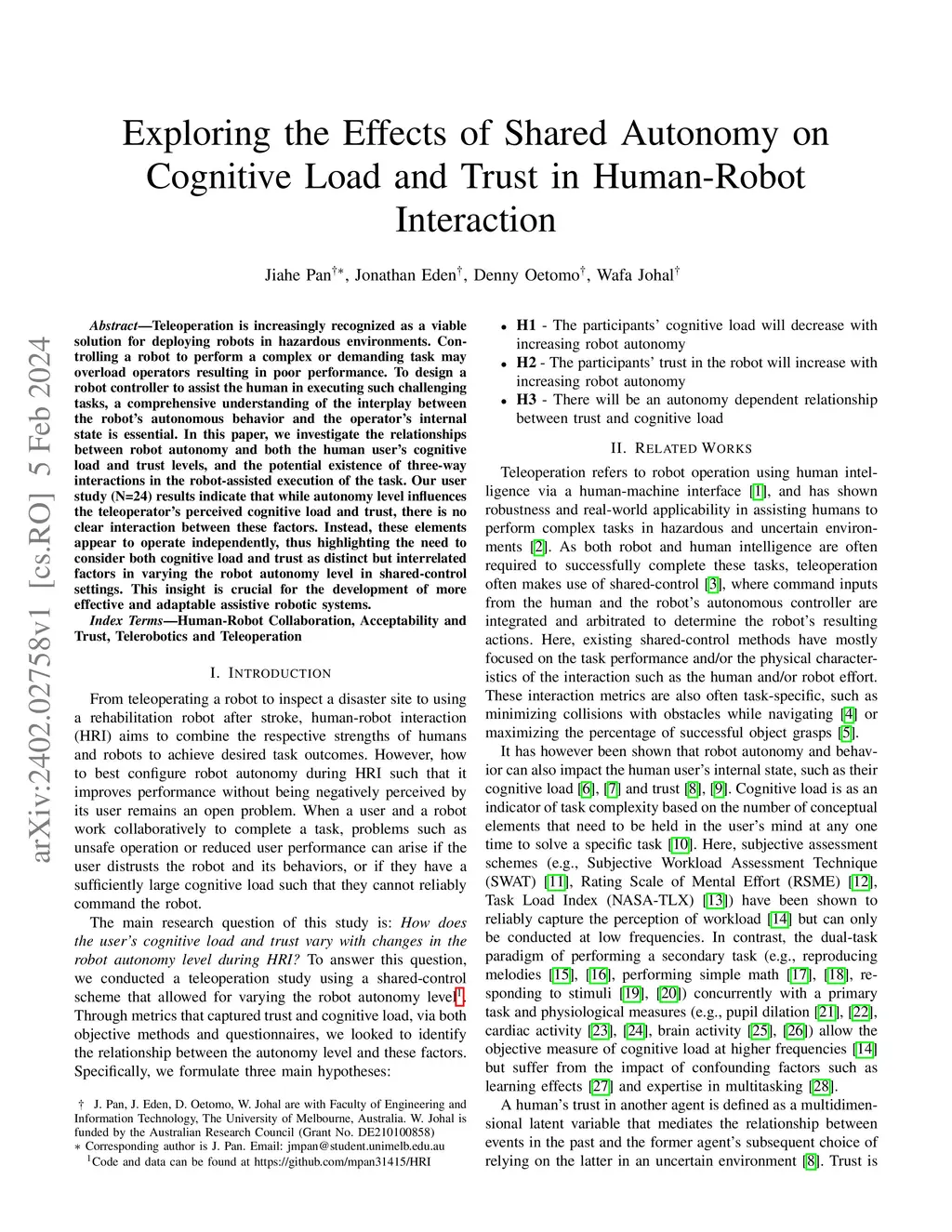 Exploring the Effects of Shared Autonomy on Cognitive Load and Trust in