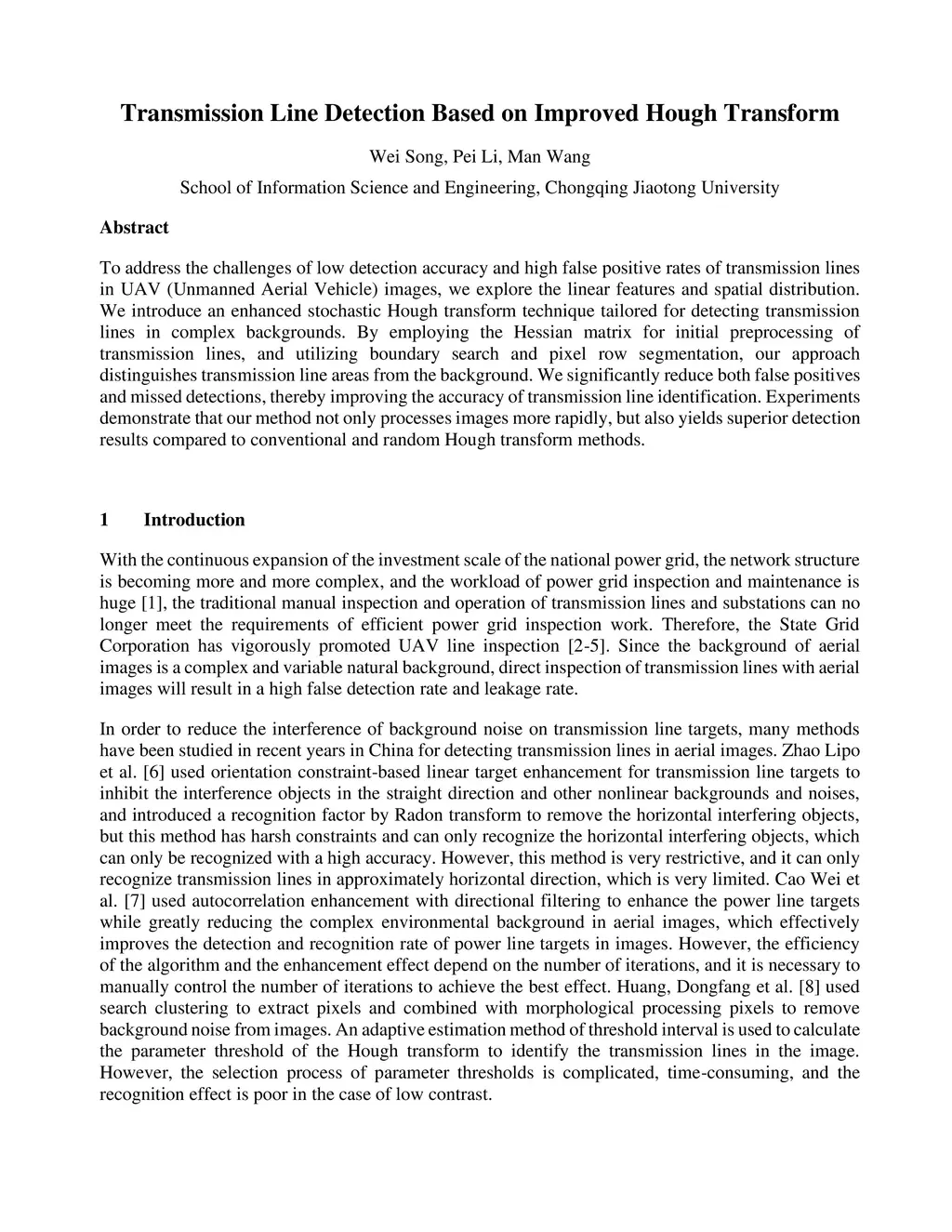To address the challenges of low detection accuracy and high false positive rates of transmission lines in UAV (Unmanned Aerial Vehicle) images, we explore the linear features and spatial distribution. We introduce an enhanced stochastic Hough transform technique tailored for detecting transmission lines in complex backgrounds. By employing the Hessian matrix for initial preprocessing of transmission lines, and utilizing boundary search and pixel row segmentation, our approach distinguishes transmission line areas from the background. We significantly reduce both false positives and missed detections, thereby improving the accuracy of transmission line identification. Experiments demonstrate that our method not only processes images more rapidly, but also yields superior detection results compared to conventional and random Hough transform methods.