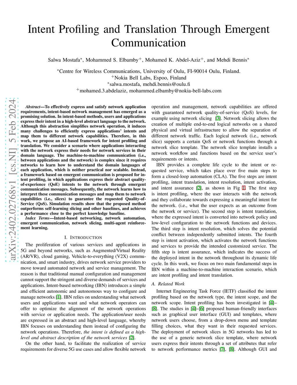 To effectively express and satisfy network application requirements, intent-based network management has emerged as a promising solution. In intent-based methods, users and applications express their intent in a high-level abstract language to the network. Although this abstraction simplifies network operation, it induces many challenges to efficiently express applications' intents and map them to different network capabilities. Therefore, in this work, we propose an AI-based framework for intent profiling and translation. We consider a scenario where applications interacting with the network express their needs for network services in their domain language. The machine-to-machine communication (i.e., between applications and the network) is complex since it requires networks to learn how to understand the domain languages of each application, which is neither practical nor scalable. Instead, a framework based on emergent communication is proposed for intent profiling, in which applications express their abstract quality-of-experience (QoE) intents to the network through emergent communication messages. Subsequently, the network learns how to interpret these communication messages and map them to network capabilities (i.e., slices) to guarantee the requested Quality-of-Service (QoS). Simulation results show that the proposed method outperforms self-learning slicing and other baselines, and achieves a performance close to the perfect knowledge baseline.