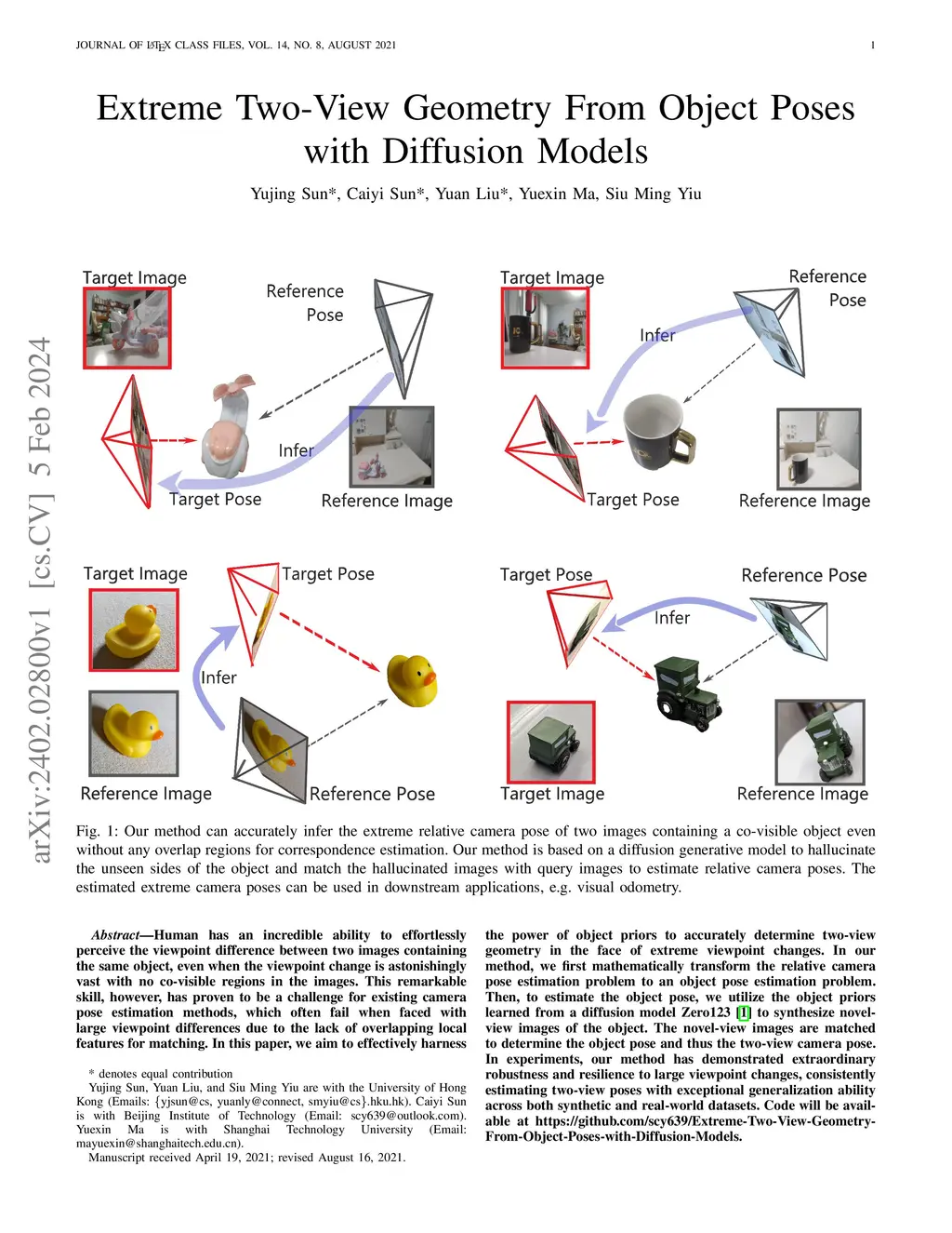 Extreme Two-View Geometry From Object Poses with Diffusion Models