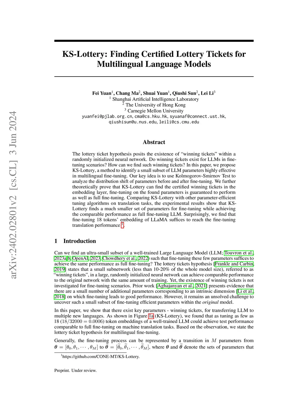The lottery ticket hypothesis posits the existence of ``winning tickets'' within a randomly initialized neural network. Do winning tickets exist for LLMs in fine-tuning scenarios? How can we find such winning tickets? In this paper, we propose KS-Lottery, a method to identify a small subset of LLM parameters highly effective in multilingual fine-tuning. Our key idea is to use Kolmogorov-Smirnov Test to analyze the distribution shift of parameters before and after fine-tuning. We further theoretically prove that KS-Lottery can find the certified winning tickets in the embedding layer, fine-tuning on the found parameters is guaranteed to perform as well as full fine-tuning. Comparing KS-Lottery with other parameter-efficient tuning algorithms on translation tasks, the experimental results show that KS-Lottery finds a much smaller set of parameters for fine-tuning while achieving the comparable performance as full fine-tuning LLM. Surprisingly, we find that fine-tuning 18 tokens' embedding of LLaMA suffices to reach the fine-tuning translation performance~\footnote{https://github.com/CONE-MT/KS-Lottery.}.