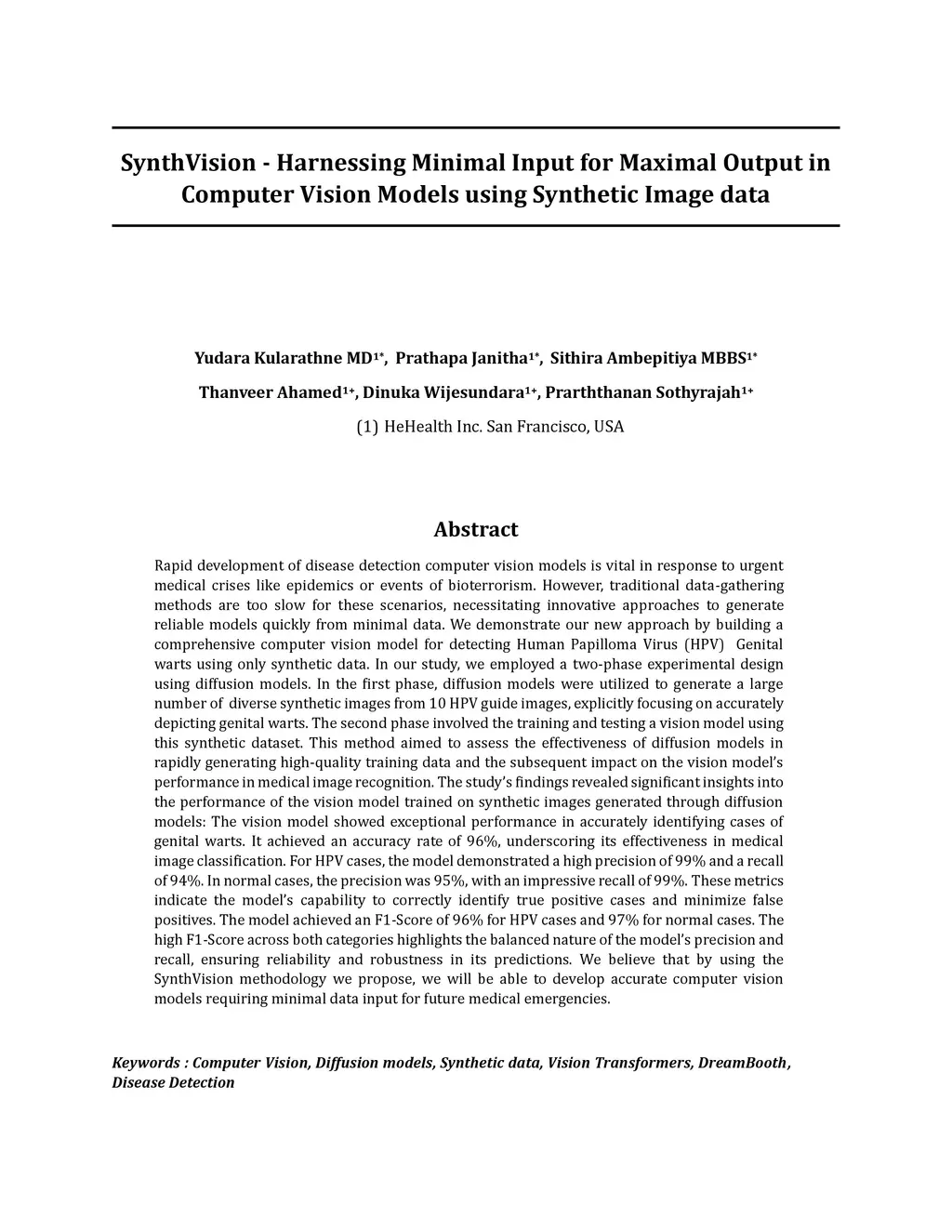 Rapid development of disease detection computer vision models is vital in response to urgent medical crises like epidemics or events of bioterrorism. However, traditional data gathering methods are too slow for these scenarios necessitating innovative approaches to generate reliable models quickly from minimal data. We demonstrate our new approach by building a comprehensive computer vision model for detecting Human Papilloma Virus Genital warts using only synthetic data. In our study, we employed a two phase experimental design using diffusion models. In the first phase diffusion models were utilized to generate a large number of diverse synthetic images from 10 HPV guide images explicitly focusing on accurately depicting genital warts. The second phase involved the training and testing vision model using this synthetic dataset. This method aimed to assess the effectiveness of diffusion models in rapidly generating high quality training data and the subsequent impact on the vision model performance in medical image recognition. The study findings revealed significant insights into the performance of the vision model trained on synthetic images generated through diffusion models. The vision model showed exceptional performance in accurately identifying cases of genital warts. It achieved an accuracy rate of 96% underscoring its effectiveness in medical image classification. For HPV cases the model demonstrated a high precision of 99% and a recall of 94%. In normal cases the precision was 95% with an impressive recall of 99%. These metrics indicate the model capability to correctly identify true positive cases and minimize false positives. The model achieved an F1 Score of 96% for HPV cases and 97% for normal cases. The high F1 Score across both categories highlights the balanced nature of the model precision and recall ensuring reliability and robustness in its predictions.