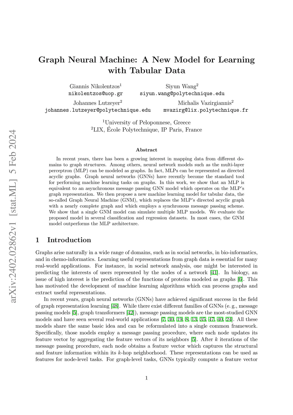 In recent years, there has been a growing interest in mapping data from different domains to graph structures. Among others, neural network models such as the multi-layer perceptron (MLP) can be modeled as graphs. In fact, MLPs can be represented as directed acyclic graphs. Graph neural networks (GNNs) have recently become the standard tool for performing machine learning tasks on graphs. In this work, we show that an MLP is equivalent to an asynchronous message passing GNN model which operates on the MLP's graph representation. We then propose a new machine learning model for tabular data, the so-called Graph Neural Machine (GNM), which replaces the MLP's directed acyclic graph with a nearly complete graph and which employs a synchronous message passing scheme. We show that a single GNM model can simulate multiple MLP models. We evaluate the proposed model in several classification and regression datasets. In most cases, the GNM model outperforms the MLP architecture.