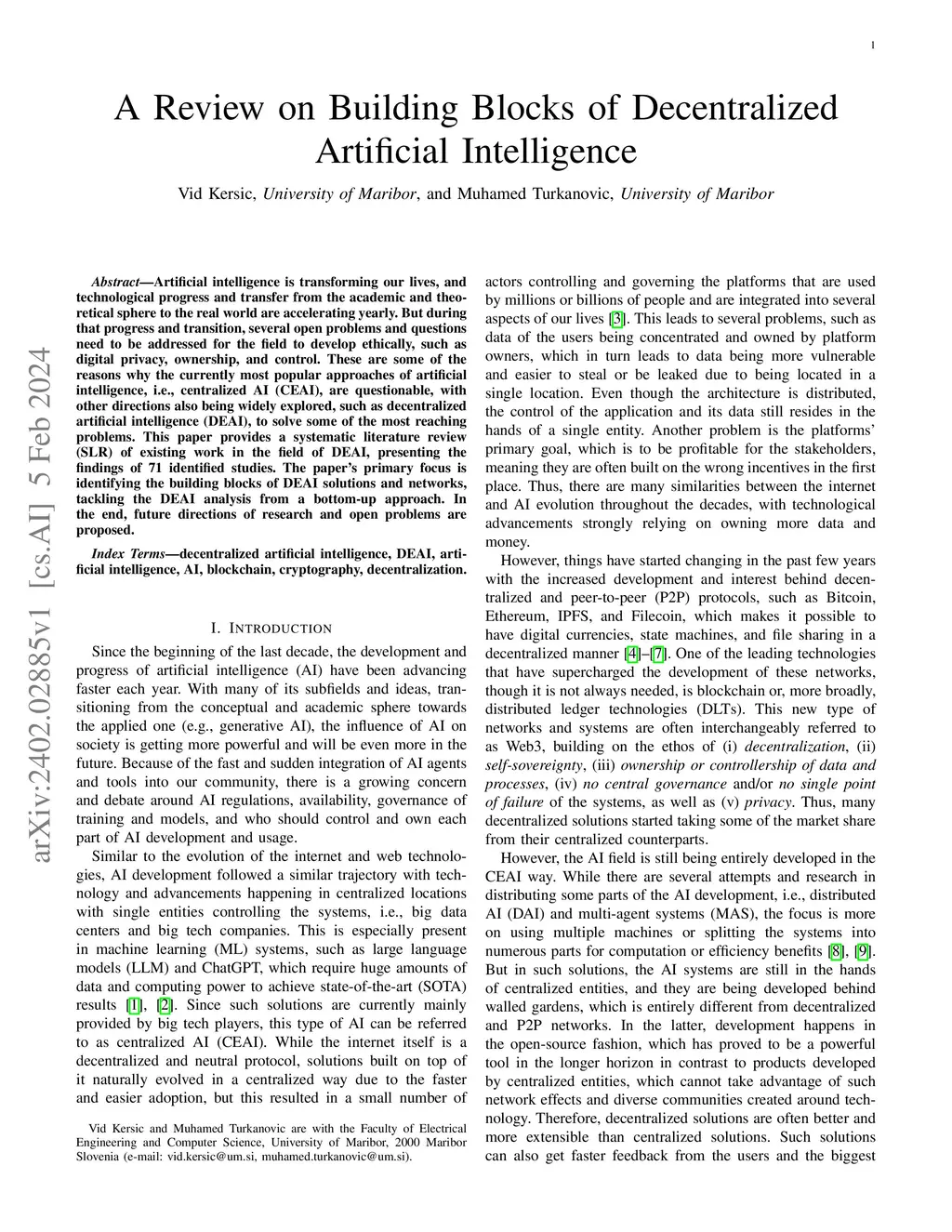 Artificial intelligence is transforming our lives, and technological progress and transfer from the academic and theoretical sphere to the real world are accelerating yearly. But during that progress and transition, several open problems and questions need to be addressed for the field to develop ethically, such as digital privacy, ownership, and control. These are some of the reasons why the currently most popular approaches of artificial intelligence, i.e., centralized AI (CEAI), are questionable, with other directions also being widely explored, such as decentralized artificial intelligence (DEAI), to solve some of the most reaching problems. This paper provides a systematic literature review (SLR) of existing work in the field of DEAI, presenting the findings of 71 identified studies. The paper's primary focus is identifying the building blocks of DEAI solutions and networks, tackling the DEAI analysis from a bottom-up approach. In the end, future directions of research and open problems are proposed.