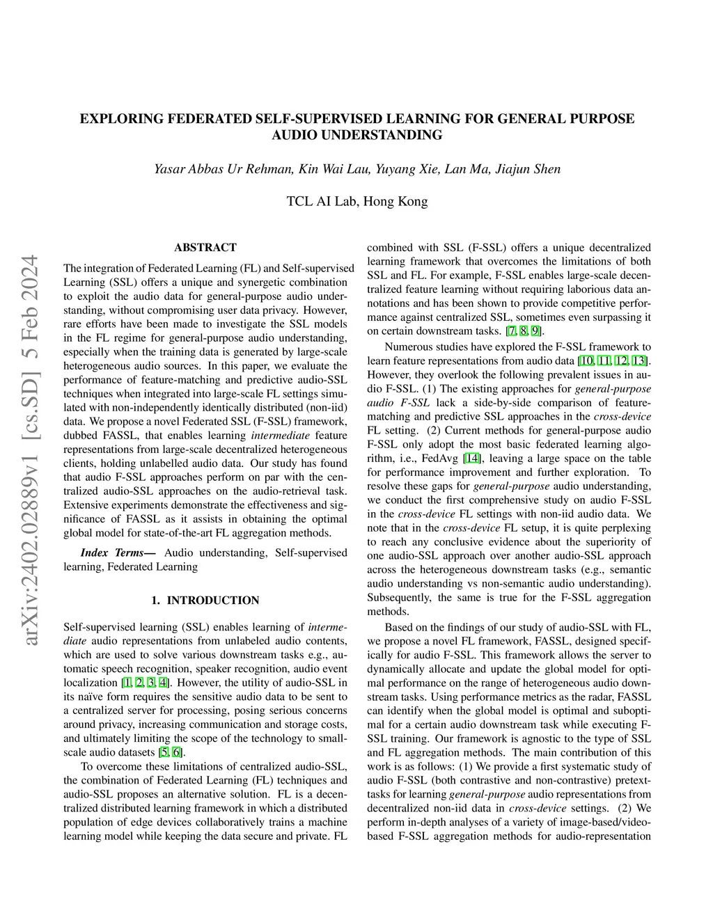 The integration of Federated Learning (FL) and Self-supervised Learning (SSL) offers a unique and synergetic combination to exploit the audio data for general-purpose audio understanding, without compromising user data privacy. However, rare efforts have been made to investigate the SSL models in the FL regime for general-purpose audio understanding, especially when the training data is generated by large-scale heterogeneous audio sources. In this paper, we evaluate the performance of feature-matching and predictive audio-SSL techniques when integrated into large-scale FL settings simulated with non-independently identically distributed (non-iid) data. We propose a novel Federated SSL (F-SSL) framework, dubbed FASSL, that enables learning intermediate feature representations from large-scale decentralized heterogeneous clients, holding unlabelled audio data. Our study has found that audio F-SSL approaches perform on par with the centralized audio-SSL approaches on the audio-retrieval task. Extensive experiments demonstrate the effectiveness and significance of FASSL as it assists in obtaining the optimal global model for state-of-the-art FL aggregation methods.