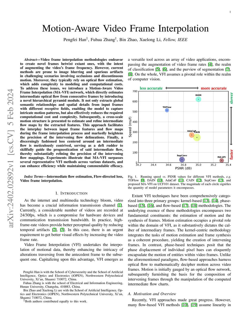 Video frame interpolation methodologies endeavor to create novel frames betwixt extant ones, with the intent of augmenting the video's frame frequency. However, current methods are prone to image blurring and spurious artifacts in challenging scenarios involving occlusions and discontinuous motion. Moreover, they typically rely on optical flow estimation, which adds complexity to modeling and computational costs. To address these issues, we introduce a Motion-Aware Video Frame Interpolation (MA-VFI) network, which directly estimates intermediate optical flow from consecutive frames by introducing a novel hierarchical pyramid module. It not only extracts global semantic relationships and spatial details from input frames with different receptive fields, enabling the model to capture intricate motion patterns, but also effectively reduces the required computational cost and complexity. Subsequently, a cross-scale motion structure is presented to estimate and refine intermediate flow maps by the extracted features. This approach facilitates the interplay between input frame features and flow maps during the frame interpolation process and markedly heightens the precision of the intervening flow delineations. Finally, a discerningly fashioned loss centered around an intermediate flow is meticulously contrived, serving as a deft rudder to skillfully guide the prognostication of said intermediate flow, thereby substantially refining the precision of the intervening flow mappings. Experiments illustrate that MA-VFI surpasses several representative VFI methods across various datasets, and can enhance efficiency while maintaining commendable efficacy.