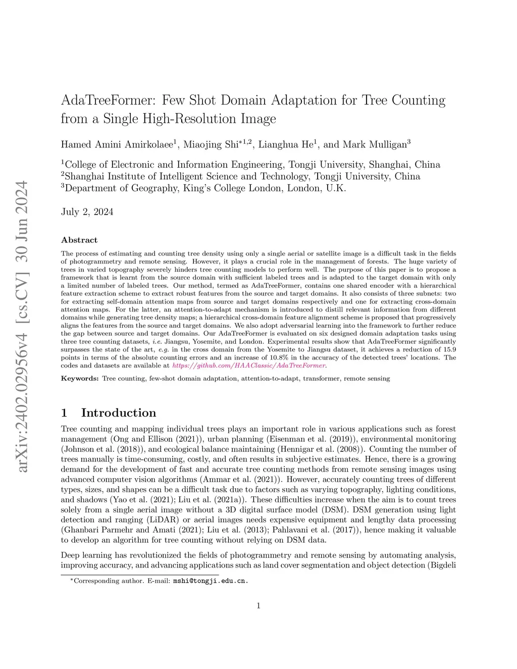AdaTreeFormer: Few Shot Domain Adaptation for Tree Counting from a