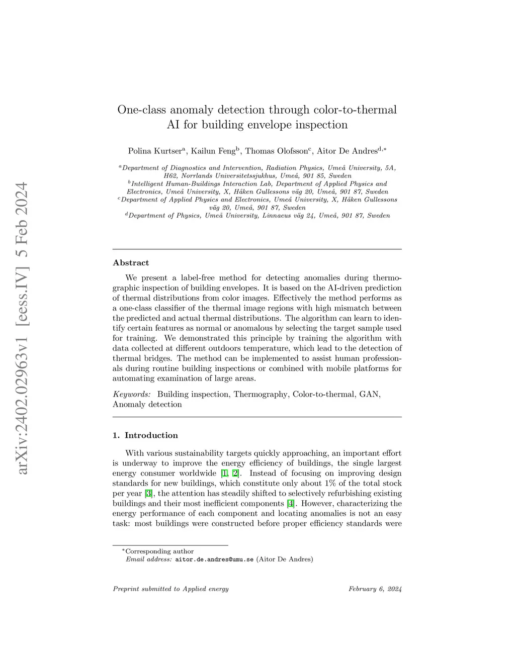 One-class anomaly detection through color-to-thermal AI for building