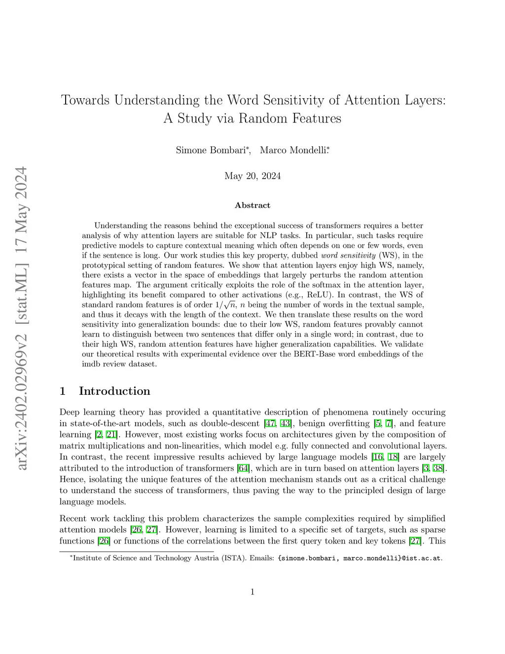 Understanding the reasons behind the exceptional success of transformers requires a better analysis of why attention layers are suitable for NLP tasks. In particular, such tasks require predictive models to capture contextual meaning which often depends on one or few words, even if the sentence is long. Our work studies this key property, dubbed word sensitivity (WS), in the prototypical setting of random features. We show that attention layers enjoy high WS, namely, there exists a vector in the space of embeddings that largely perturbs the random attention features map. The argument critically exploits the role of the softmax in the attention layer, highlighting its benefit compared to other activations (e.g., ReLU). In contrast, the WS of standard random features is of order , being the number of words in the textual sample, and thus it decays with the length of the context. We then translate these results on the word sensitivity into generalization bounds: due to their low WS, random features provably cannot learn to distinguish between two sentences that differ only in a single word; in contrast, due to their high WS, random attention features have higher generalization capabilities. We validate our theoretical results with experimental evidence over the BERT-Base word embeddings of the imdb review dataset.