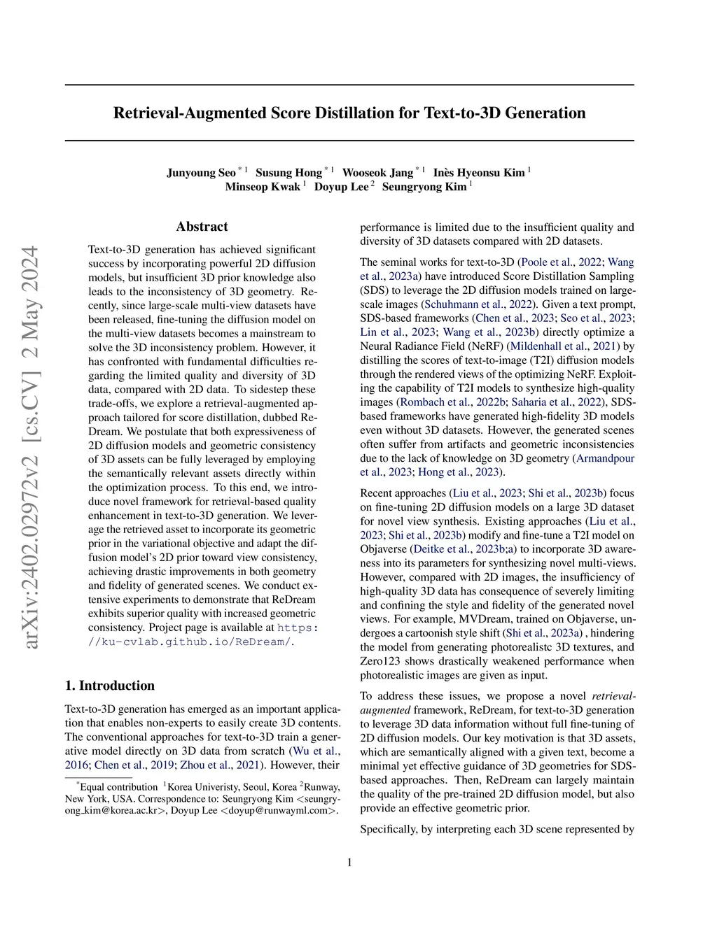 Text-to-3D generation has achieved significant success by incorporating powerful 2D diffusion models, but insufficient 3D prior knowledge also leads to the inconsistency of 3D geometry. Recently, since large-scale multi-view datasets have been released, fine-tuning the diffusion model on the multi-view datasets becomes a mainstream to solve the 3D inconsistency problem. However, it has confronted with fundamental difficulties regarding the limited quality and diversity of 3D data, compared with 2D data. To sidestep these trade-offs, we explore a retrieval-augmented approach tailored for score distillation, dubbed ReDream. We postulate that both expressiveness of 2D diffusion models and geometric consistency of 3D assets can be fully leveraged by employing the semantically relevant assets directly within the optimization process. To this end, we introduce novel framework for retrieval-based quality enhancement in text-to-3D generation. We leverage the retrieved asset to incorporate its geometric prior in the variational objective and adapt the diffusion model's 2D prior toward view consistency, achieving drastic improvements in both geometry and fidelity of generated scenes. We conduct extensive experiments to demonstrate that ReDream exhibits superior quality with increased geometric consistency. Project page is available at https://ku-cvlab.github.io/ReDream/.