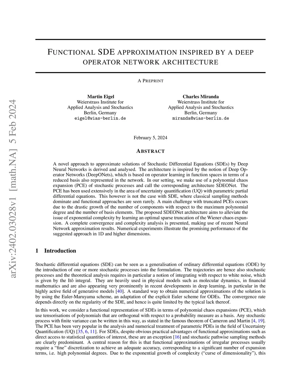 A novel approach to approximate solutions of Stochastic Differential Equations (SDEs) by Deep Neural Networks is derived and analysed. The architecture is inspired by the notion of Deep Operator Networks (DeepONets), which is based on operator learning in function spaces in terms of a reduced basis also represented in the network. In our setting, we make use of a polynomial chaos expansion (PCE) of stochastic processes and call the corresponding architecture SDEONet. The PCE has been used extensively in the area of uncertainty quantification (UQ) with parametric partial differential equations. This however is not the case with SDE, where classical sampling methods dominate and functional approaches are seen rarely. A main challenge with truncated PCEs occurs due to the drastic growth of the number of components with respect to the maximum polynomial degree and the number of basis elements. The proposed SDEONet architecture aims to alleviate the issue of exponential complexity by learning an optimal sparse truncation of the Wiener chaos expansion. A complete convergence and complexity analysis is presented, making use of recent Neural Network approximation results. Numerical experiments illustrate the promising performance of the suggested approach in 1D and higher dimensions.