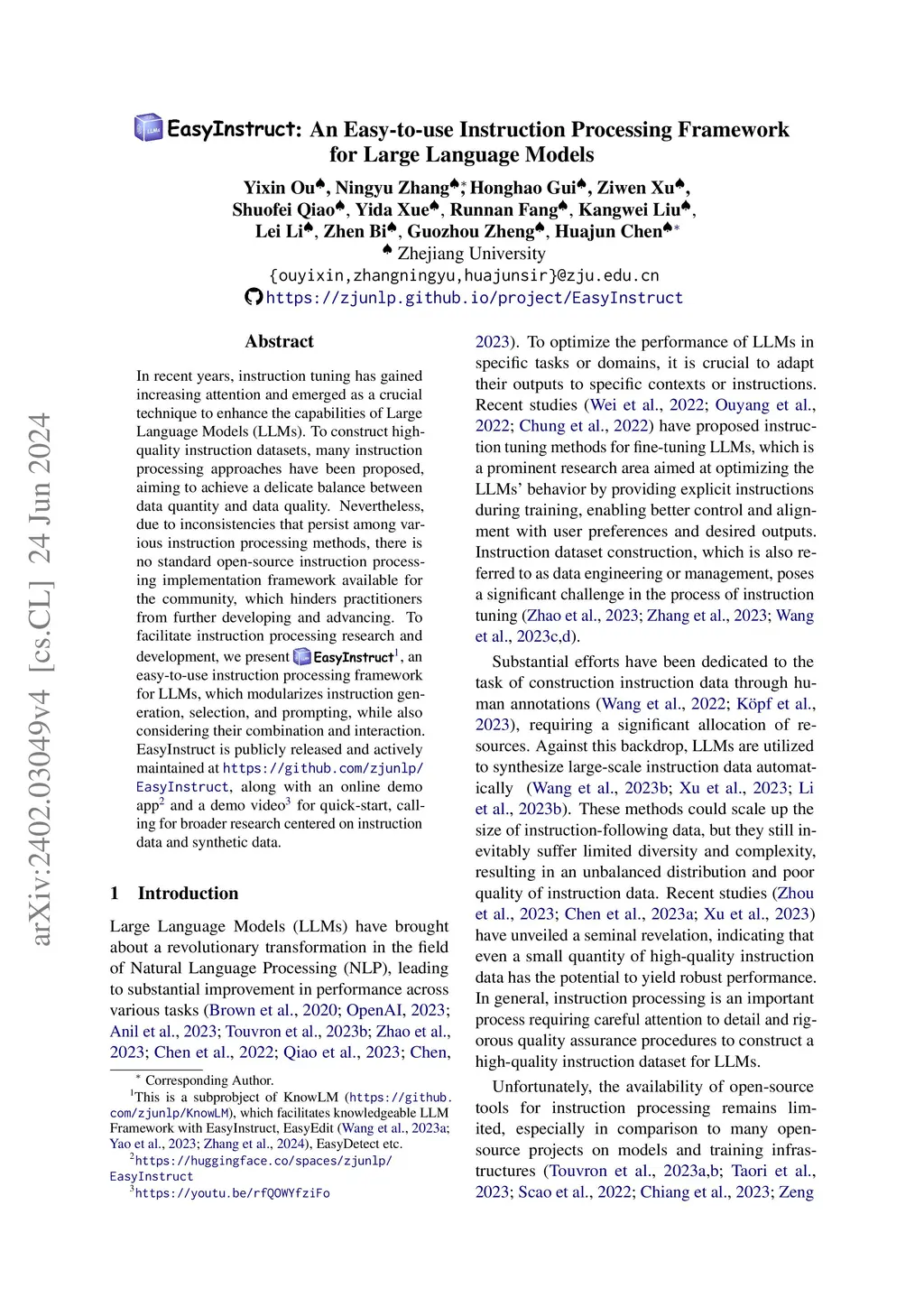 In recent years, instruction tuning has gained increasing attention and emerged as a crucial technique to enhance the capabilities of Large Language Models (LLMs). To construct high-quality instruction datasets, many instruction processing approaches have been proposed, aiming to achieve a delicate balance between data quantity and data quality. Nevertheless, due to inconsistencies that persist among various instruction processing methods, there is no standard open-source instruction processing implementation framework available for the community, which hinders practitioners from further developing and advancing. To facilitate instruction processing research and development, we present EasyInstruct, an easy-to-use instruction processing framework for LLMs, which modularizes instruction generation, selection, and prompting, while also considering their combination and interaction. EasyInstruct is publicly released and actively maintained at https://github.com/zjunlp/EasyInstruct, along with an online demo app and a demo video for quick-start, calling for broader research centered on instruction data and synthetic data.