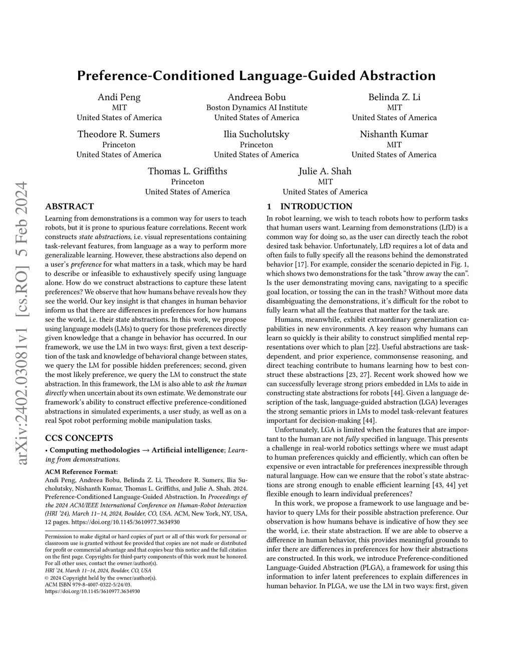 Learning from demonstrations is a common way for users to teach robots, but it is prone to spurious feature correlations. Recent work constructs state abstractions, i.e. visual representations containing task-relevant features, from language as a way to perform more generalizable learning. However, these abstractions also depend on a user's preference for what matters in a task, which may be hard to describe or infeasible to exhaustively specify using language alone. How do we construct abstractions to capture these latent preferences? We observe that how humans behave reveals how they see the world. Our key insight is that changes in human behavior inform us that there are differences in preferences for how humans see the world, i.e. their state abstractions. In this work, we propose using language models (LMs) to query for those preferences directly given knowledge that a change in behavior has occurred. In our framework, we use the LM in two ways: first, given a text description of the task and knowledge of behavioral change between states, we query the LM for possible hidden preferences; second, given the most likely preference, we query the LM to construct the state abstraction. In this framework, the LM is also able to ask the human directly when uncertain about its own estimate. We demonstrate our framework's ability to construct effective preference-conditioned abstractions in simulated experiments, a user study, as well as on a real Spot robot performing mobile manipulation tasks.