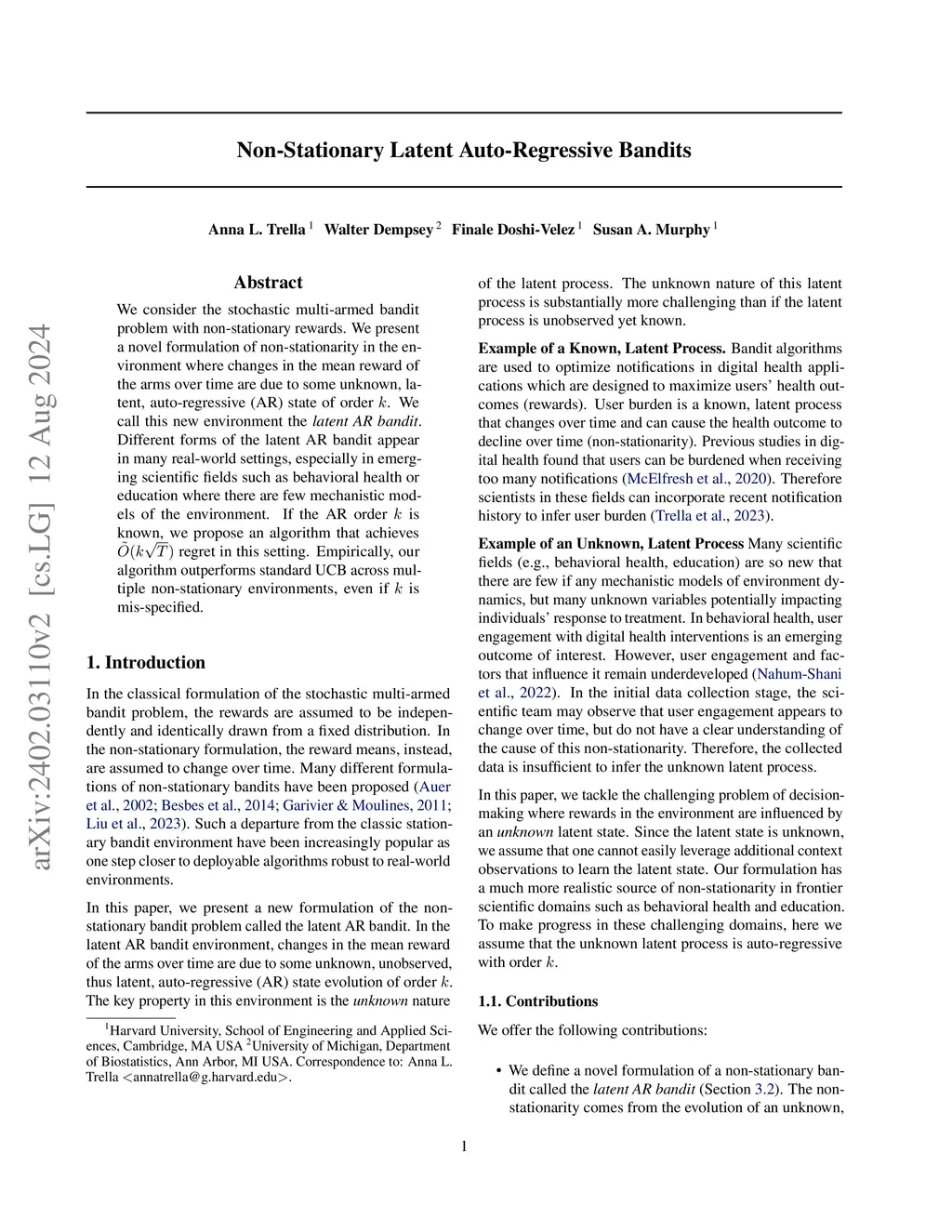 For the non-stationary multi-armed bandit (MAB) problem, many existing methods allow a general mechanism for the non-stationarity, but rely on a budget for the non-stationarity that is sub-linear to the total number of time steps . In many real-world settings, however, the mechanism for the non-stationarity can be modeled, but there is no budget for the non-stationarity. We instead consider the non-stationary bandit problem where the reward means change due to a latent, auto-regressive (AR) state. We develop Latent AR LinUCB (LARL), an online linear contextual bandit algorithm that does not rely on the non-stationary budget, but instead forms good predictions of reward means by implicitly predicting the latent state. The key idea is to reduce the problem to a linear dynamical system which can be solved as a linear contextual bandit. In fact, LARL approximates a steady-state Kalman filter and efficiently learns system parameters online. We provide an interpretable regret bound for LARL with respect to the level of non-stationarity in the environment. LARL achieves sub-linear regret in this setting if the noise variance of the latent state process is sufficiently small with respect to . Empirically, LARL outperforms various baseline methods in this non-stationary bandit problem.