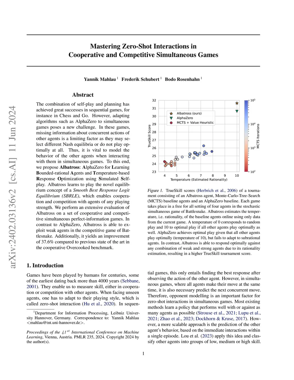 The combination of self-play and planning has achieved great successes in sequential games, for instance in Chess and Go. However, adapting algorithms such as AlphaZero to simultaneous games poses a new challenge. In these games, missing information about concurrent actions of other agents is a limiting factor as they may select different Nash equilibria or do not play optimally at all. Thus, it is vital to model the behavior of the other agents when interacting with them in simultaneous games. To this end, we propose Albatross: AlphaZero for Learning Bounded-rational Agents and Temperature-based Response Optimization using Simulated Self-play. Albatross learns to play the novel equilibrium concept of a Smooth Best Response Logit Equilibrium (SBRLE), which enables cooperation and competition with agents of any playing strength. We perform an extensive evaluation of Albatross on a set of cooperative and competitive simultaneous perfect-information games. In contrast to AlphaZero, Albatross is able to exploit weak agents in the competitive game of Battlesnake. Additionally, it yields an improvement of 37.6% compared to previous state of the art in the cooperative Overcooked benchmark.