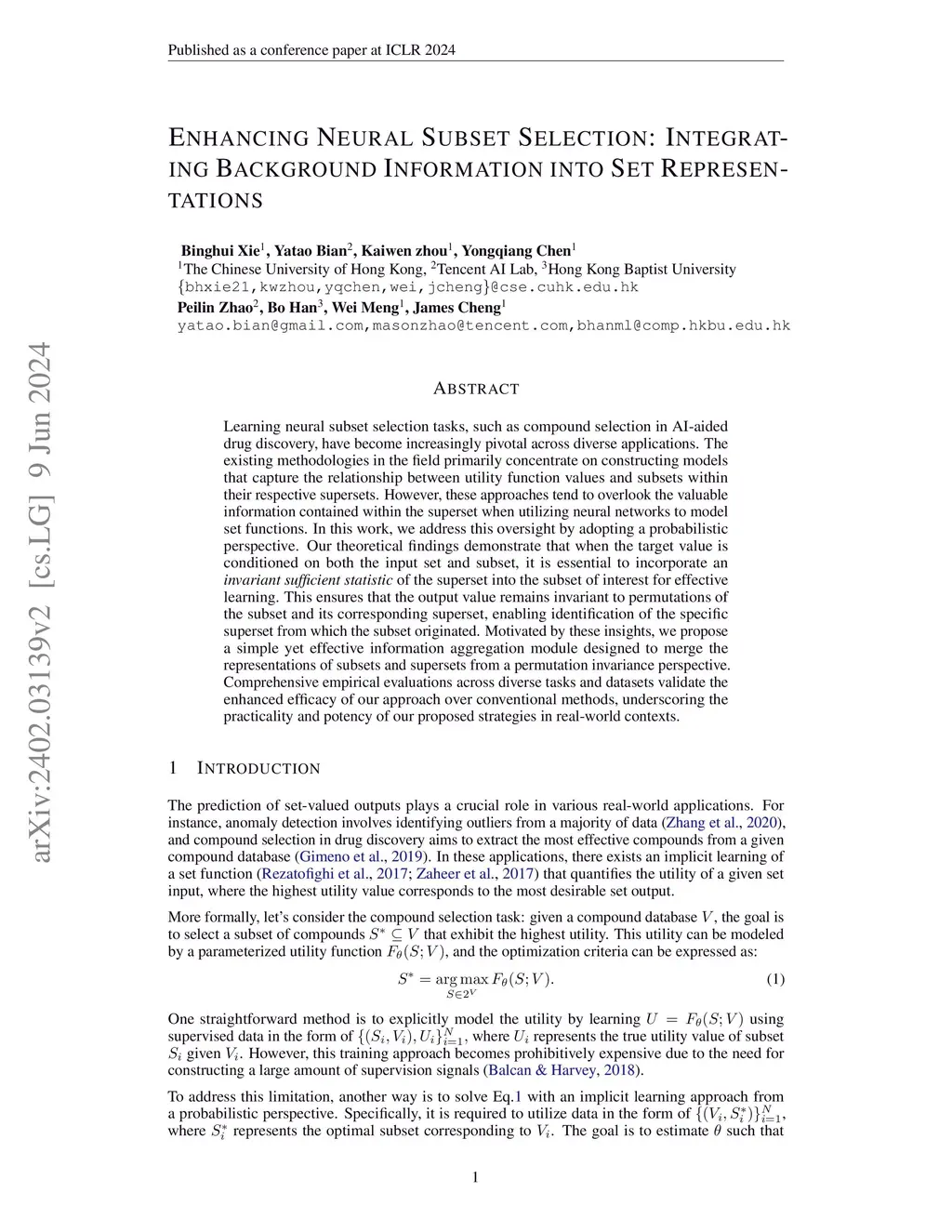 Learning neural subset selection tasks, such as compound selection in AI-aided drug discovery, have become increasingly pivotal across diverse applications. The existing methodologies in the field primarily concentrate on constructing models that capture the relationship between utility function values and subsets within their respective supersets. However, these approaches tend to overlook the valuable information contained within the superset when utilizing neural networks to model set functions. In this work, we address this oversight by adopting a probabilistic perspective. Our theoretical findings demonstrate that when the target value is conditioned on both the input set and subset, it is essential to incorporate an \textit{invariant sufficient statistic} of the superset into the subset of interest for effective learning. This ensures that the output value remains invariant to permutations of the subset and its corresponding superset, enabling identification of the specific superset from which the subset originated. Motivated by these insights, we propose a simple yet effective information aggregation module designed to merge the representations of subsets and supersets from a permutation invariance perspective. Comprehensive empirical evaluations across diverse tasks and datasets validate the enhanced efficacy of our approach over conventional methods, underscoring the practicality and potency of our proposed strategies in real-world contexts.