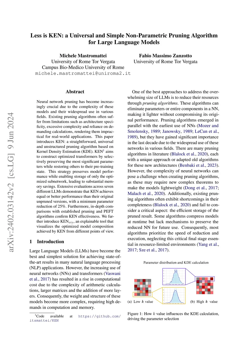 Neural network pruning has become increasingly crucial due to the complexity of these models and their widespread use in various fields. Existing pruning algorithms often suffer from limitations such as architecture specificity, excessive complexity and reliance on demanding calculations, rendering them impractical for real-world applications. This paper introduces KEN: a straightforward, universal and unstructured pruning algorithm based on Kernel Density Estimation (KDE). KEN aims to construct optimized transformers by selectively preserving the most significant parameters while restoring others to their pre-training state. This strategy preserves model performance while enabling storage of only the optimized subnetwork, leading to substantial memory savings. Extensive evaluations across seven different LLMs demonstrate that KEN achieves equal or better performance than their original unpruned versions, with a minimum parameter reduction of 25%. Furthermore, in-depth comparisons with established pruning and PEFT algorithms confirm KEN effectiveness. We further introduce KEN, an explainable tool that visualizes the optimized model composition achieved by KEN from different points of view.