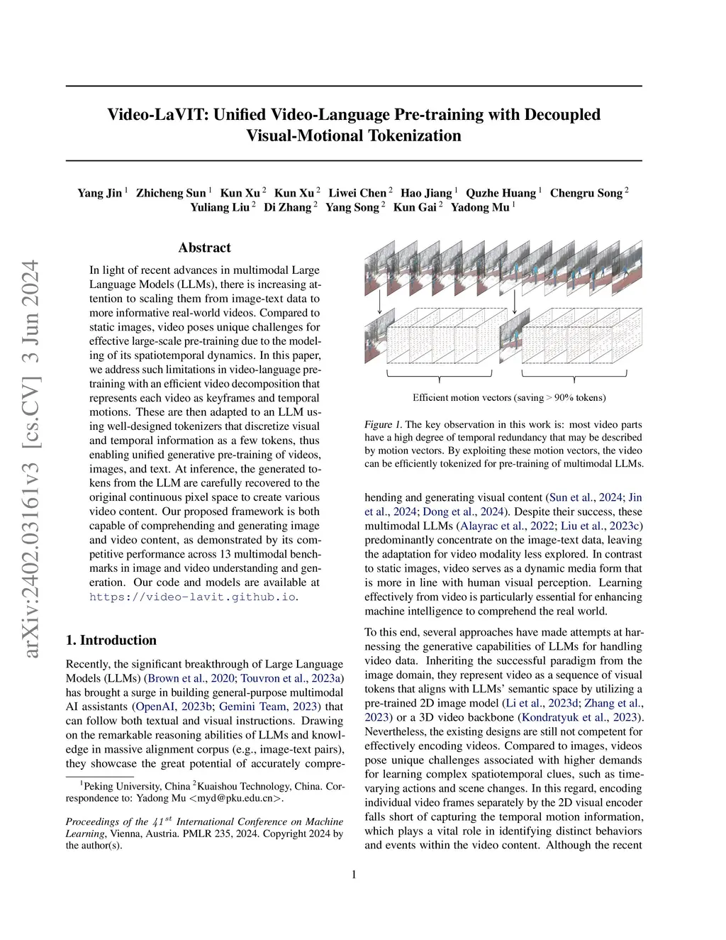In light of recent advances in multimodal Large Language Models (LLMs), there is increasing attention to scaling them from image-text data to more informative real-world videos. Compared to static images, video poses unique challenges for effective large-scale pre-training due to the modeling of its spatiotemporal dynamics. In this paper, we address such limitations in video-language pre-training with an efficient video decomposition that represents each video as keyframes and temporal motions. These are then adapted to an LLM using well-designed tokenizers that discretize visual and temporal information as a few tokens, thus enabling unified generative pre-training of videos, images, and text. At inference, the generated tokens from the LLM are carefully recovered to the original continuous pixel space to create various video content. Our proposed framework is both capable of comprehending and generating image and video content, as demonstrated by its competitive performance across 13 multimodal benchmarks in image and video understanding and generation. Our code and models are available at https://video-lavit.github.io.