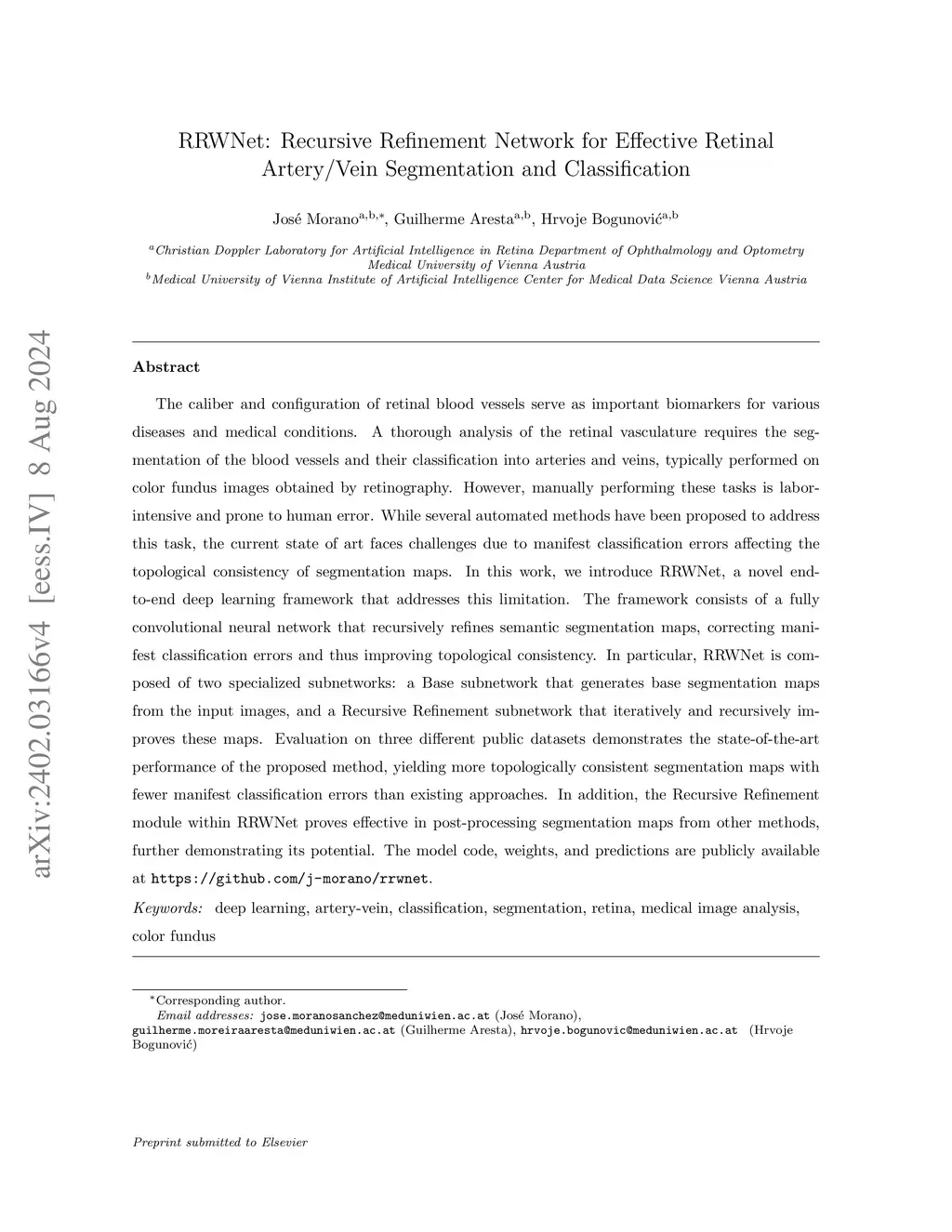 RRWNet: Recursive Refinement Network for effective retinal artery/vein segmentation and classification