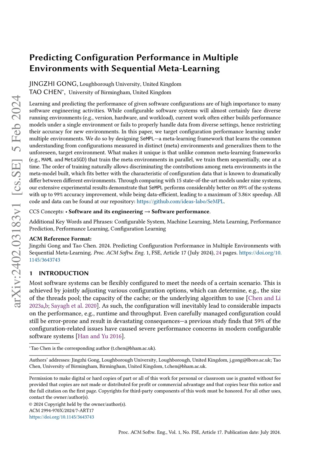 Learning and predicting the performance of given software configurations are of high importance to many software engineering activities. While configurable software systems will almost certainly face diverse running environments (e.g., version, hardware, and workload), current work often either builds performance models under a single environment or fails to properly handle data from diverse settings, hence restricting their accuracy for new environments. In this paper, we target configuration performance learning under multiple environments. We do so by designing SeMPL - a meta-learning framework that learns the common understanding from configurations measured in distinct (meta) environments and generalizes them to the unforeseen, target environment. What makes it unique is that unlike common meta-learning frameworks (e.g., MAML and MetaSGD) that train the meta environments in parallel, we train them sequentially, one at a time. The order of training naturally allows discriminating the contributions among meta environments in the meta-model built, which fits better with the characteristic of configuration data that is known to dramatically differ between different environments. Through comparing with 15 state-of-the-art models under nine systems, our extensive experimental results demonstrate that SeMPL performs considerably better on 89% of the systems with up to 99% accuracy improvement, while being data-efficient, leading to a maximum of 3.86x speedup. All code and data can be found at our repository: https://github.com/ideas-labo/SeMPL.