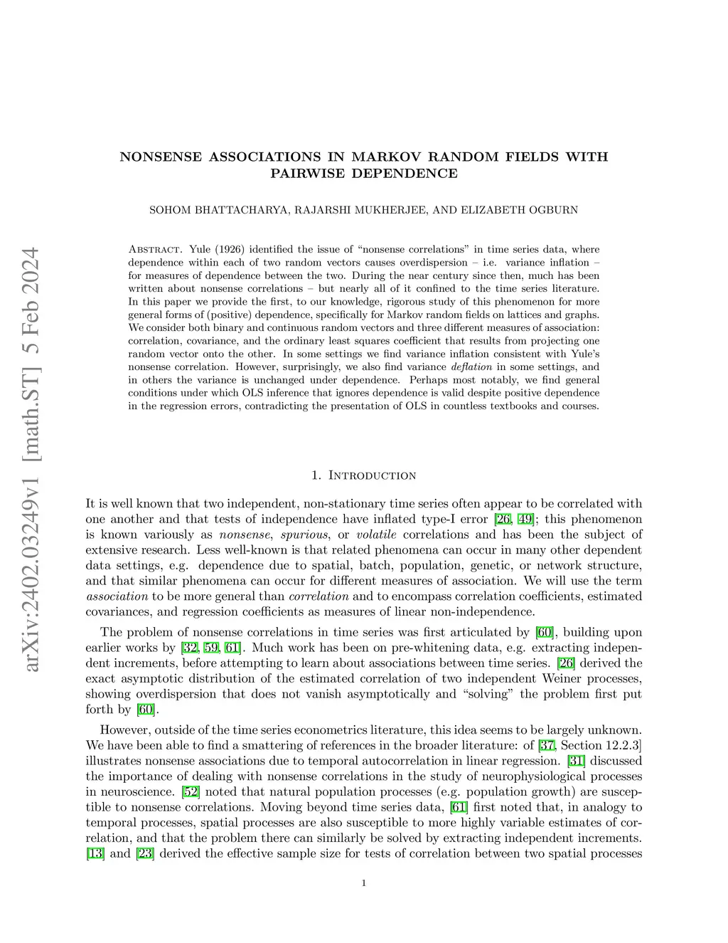 Yule (1926) identified the issue of "nonsense correlations" in time series data, where dependence within each of two random vectors causes overdispersion -- i.e. variance inflation -- for measures of dependence between the two. During the near century since then, much has been written about nonsense correlations -- but nearly all of it confined to the time series literature. In this paper we provide the first, to our knowledge, rigorous study of this phenomenon for more general forms of (positive) dependence, specifically for Markov random fields on lattices and graphs. We consider both binary and continuous random vectors and three different measures of association: correlation, covariance, and the ordinary least squares coefficient that results from projecting one random vector onto the other. In some settings we find variance inflation consistent with Yule's nonsense correlation. However, surprisingly, we also find variance deflation in some settings, and in others the variance is unchanged under dependence. Perhaps most notably, we find general conditions under which OLS inference that ignores dependence is valid despite positive dependence in the regression errors, contradicting the presentation of OLS in countless textbooks and courses.