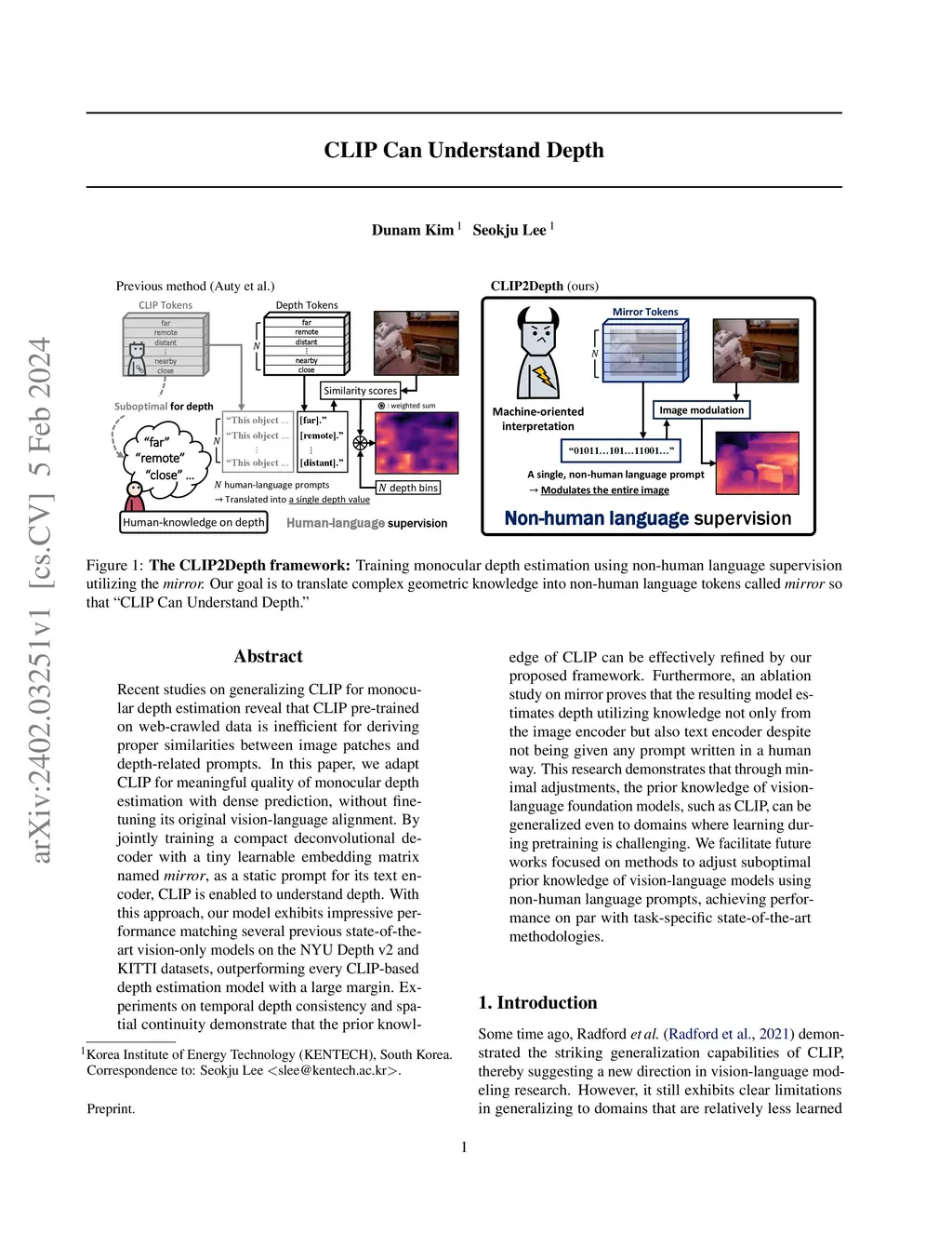 In this paper, we demonstrate that CLIP can also be adapted to downstream tasks where its vision-language alignment is suboptimally learned during pre-training on web-crawled data, all without requiring fine-tuning. We explore the case of monocular depth estimation, where CLIP's contrastive prior struggles to generalize, compared to its success in domains such as generative modeling and semantic segmentation. Since CLIP fails to consistently capture similarities between image patches and natural language prompts describing distance, we eliminate the use of its pre-trained natural language token embeddings and distill the semantic prior of its frozen text encoder into a single learnable embedding matrix called "mirror". The main design goal of mirror is to derive a non-human language prompt that approximates an optimal natural language prompt: "How far is this location from the camera?" Using this approach, we jointly train two lightweight modules, a mirror and a compact decoder, on top of a frozen CLIP for dense depth prediction. Compared to conventional depth models, our framework is significantly more efficient in terms of parameters and computation. The resulting model exhibits impressive performance, matching several state-of-the-art vision models on the NYU Depth v2 and KITTI benchmark datasets, while outperforming all vision-language depth models based on a frozen CLIP prior. Experiments demonstrate that the suboptimal depth understanding of CLIP in terms of spatial and temporal consistency can be significantly corrected without either fine-tuning it or concatenating mirror with its pre-trained subword token embeddings. Furthermore, an ablation study on the convergence status of mirror shows that it is implicitly trained to capture objects, such as humans and windows, where semantic cues play an important role in detection.