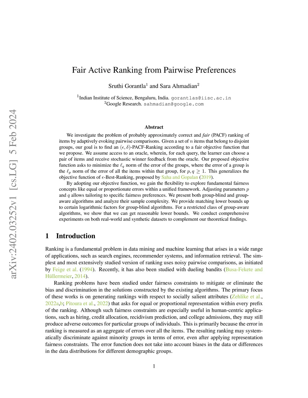 We investigate the problem of probably approximately correct and fair (PACF) ranking of items by adaptively evoking pairwise comparisons. Given a set of items that belong to disjoint groups, our goal is to find an -PACF-Ranking according to a fair objective function that we propose. We assume access to an oracle, wherein, for each query, the learner can choose a pair of items and receive stochastic winner feedback from the oracle. Our proposed objective function asks to minimize the norm of the error of the groups, where the error of a group is the norm of the error of all the items within that group, for . This generalizes the objective function of -Best-Ranking, proposed by Saha & Gopalan (2019). By adopting our objective function, we gain the flexibility to explore fundamental fairness concepts like equal or proportionate errors within a unified framework. Adjusting parameters and allows tailoring to specific fairness preferences. We present both group-blind and group-aware algorithms and analyze their sample complexity. We provide matching lower bounds up to certain logarithmic factors for group-blind algorithms. For a restricted class of group-aware algorithms, we show that we can get reasonable lower bounds. We conduct comprehensive experiments on both real-world and synthetic datasets to complement our theoretical findings.