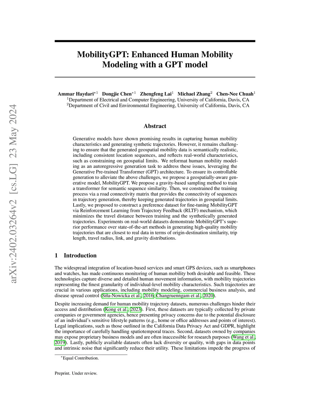 Generative models have shown promising results in capturing human mobility characteristics and generating synthetic trajectories. However, it remains challenging to ensure that the generated geospatial mobility data is semantically realistic, including consistent location sequences, and reflects real-world characteristics, such as constraining on geospatial limits. We reformat human mobility modeling as an autoregressive generation task to address these issues, leveraging the Generative Pre-trained Transformer (GPT) architecture. To ensure its controllable generation to alleviate the above challenges, we propose a geospatially-aware generative model, MobilityGPT. We propose a gravity-based sampling method to train a transformer for semantic sequence similarity. Then, we constrained the training process via a road connectivity matrix that provides the connectivity of sequences in trajectory generation, thereby keeping generated trajectories in geospatial limits. Lastly, we proposed to construct a preference dataset for fine-tuning MobilityGPT via Reinforcement Learning from Trajectory Feedback (RLTF) mechanism, which minimizes the travel distance between training and the synthetically generated trajectories. Experiments on real-world datasets demonstrate MobilityGPT's superior performance over state-of-the-art methods in generating high-quality mobility trajectories that are closest to real data in terms of origin-destination similarity, trip length, travel radius, link, and gravity distributions. We release the source code and reference links to datasets atthis https URL.