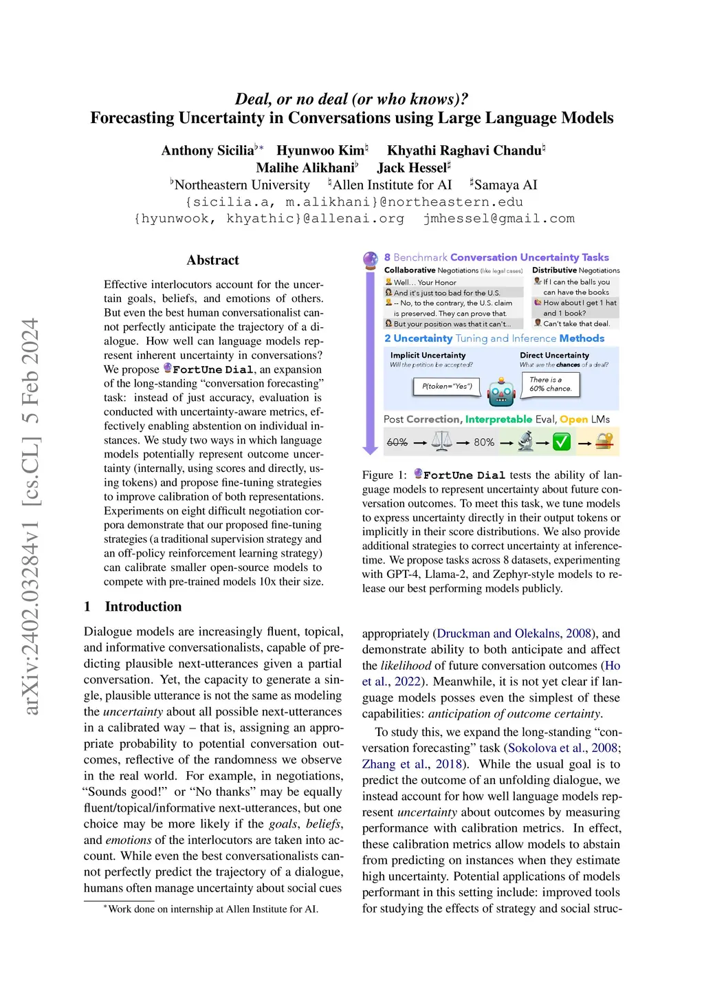 Effective interlocutors account for the uncertain goals, beliefs, and emotions of others. But even the best human conversationalist cannot perfectly anticipate the trajectory of a dialogue. How well can language models represent inherent uncertainty in conversations? We propose FortUne Dial, an expansion of the long-standing "conversation forecasting" task: instead of just accuracy, evaluation is conducted with uncertainty-aware metrics, effectively enabling abstention on individual instances. We study two ways in which language models potentially represent outcome uncertainty (internally, using scores and directly, using tokens) and propose fine-tuning strategies to improve calibration of both representations. Experiments on eight difficult negotiation corpora demonstrate that our proposed fine-tuning strategies (a traditional supervision strategy and an off-policy reinforcement learning strategy) can calibrate smaller open-source models to compete with pre-trained models 10x their size.