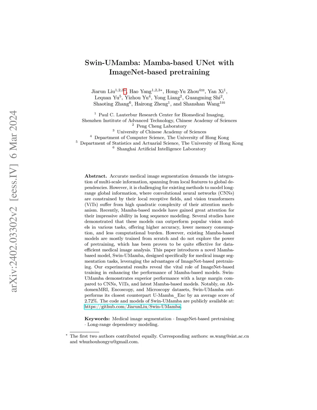 Swin-UMamba: Mamba-based UNet with ImageNet-based pretraining